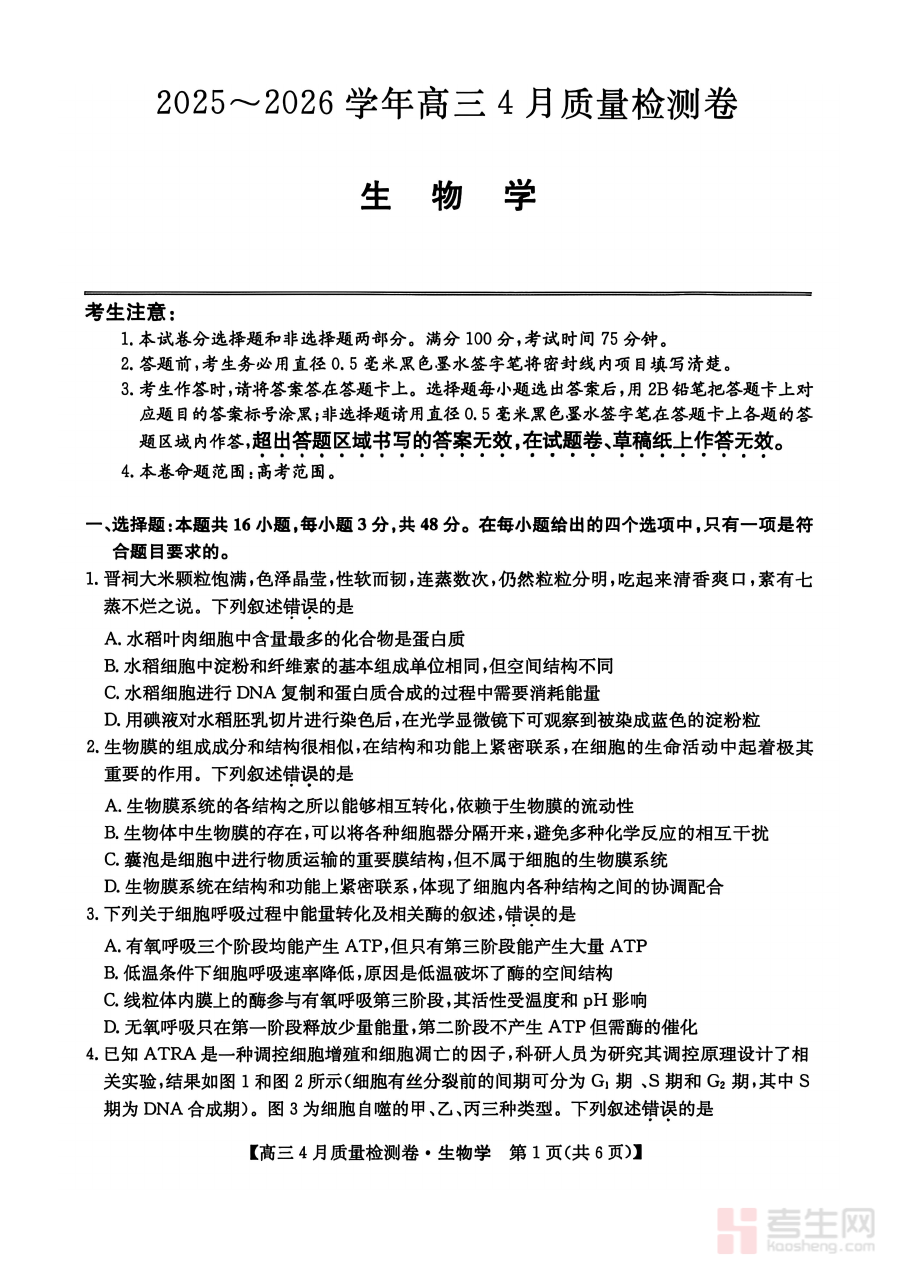 该检测卷主要用于高三生物学科的阶段性学情诊断,帮助教师精准把握学生在当前复习阶段对生物知识的理解深度与应用能力,辅助学生发现自身学习中的薄弱环节与知识盲区,同时为联盟内各学校调整生物学科教学计划、优化备考策略提供数据支撑,是衔接高三中期复习与后期冲刺的重要检测工具。