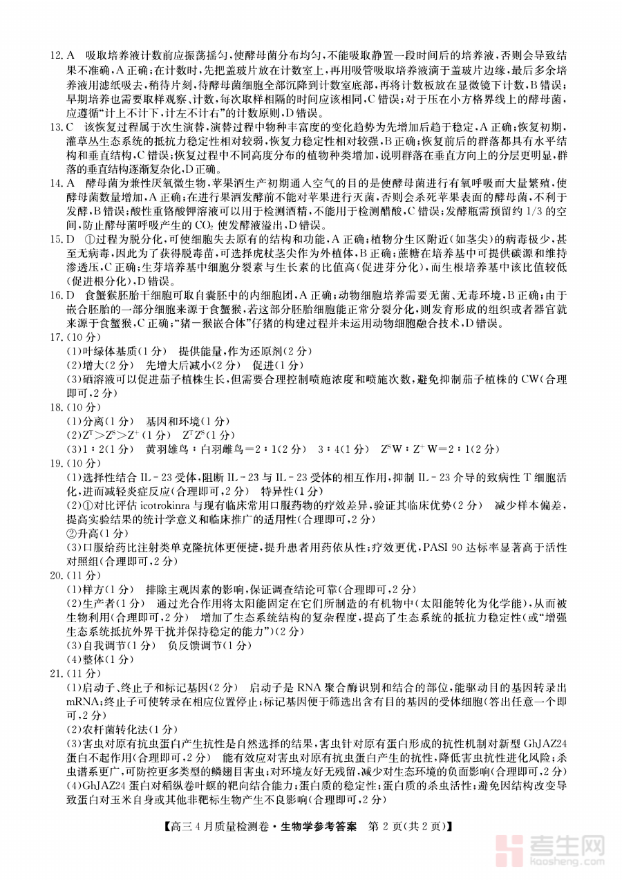 这份答案资料的核心用途在于辅助完成质量检测后的结果分析与学情诊断。对于教学者而言,它能够帮助快速核对学生答题情况,精准识别班级整体及个体在生物学科知识模块、能力维度上的优势与不足;对于考生来说,则可通过对比答案进行自我评估,明确自身在检测中暴露的知识漏洞与答题规范性问题,为后续复习提供清晰的方向指引。