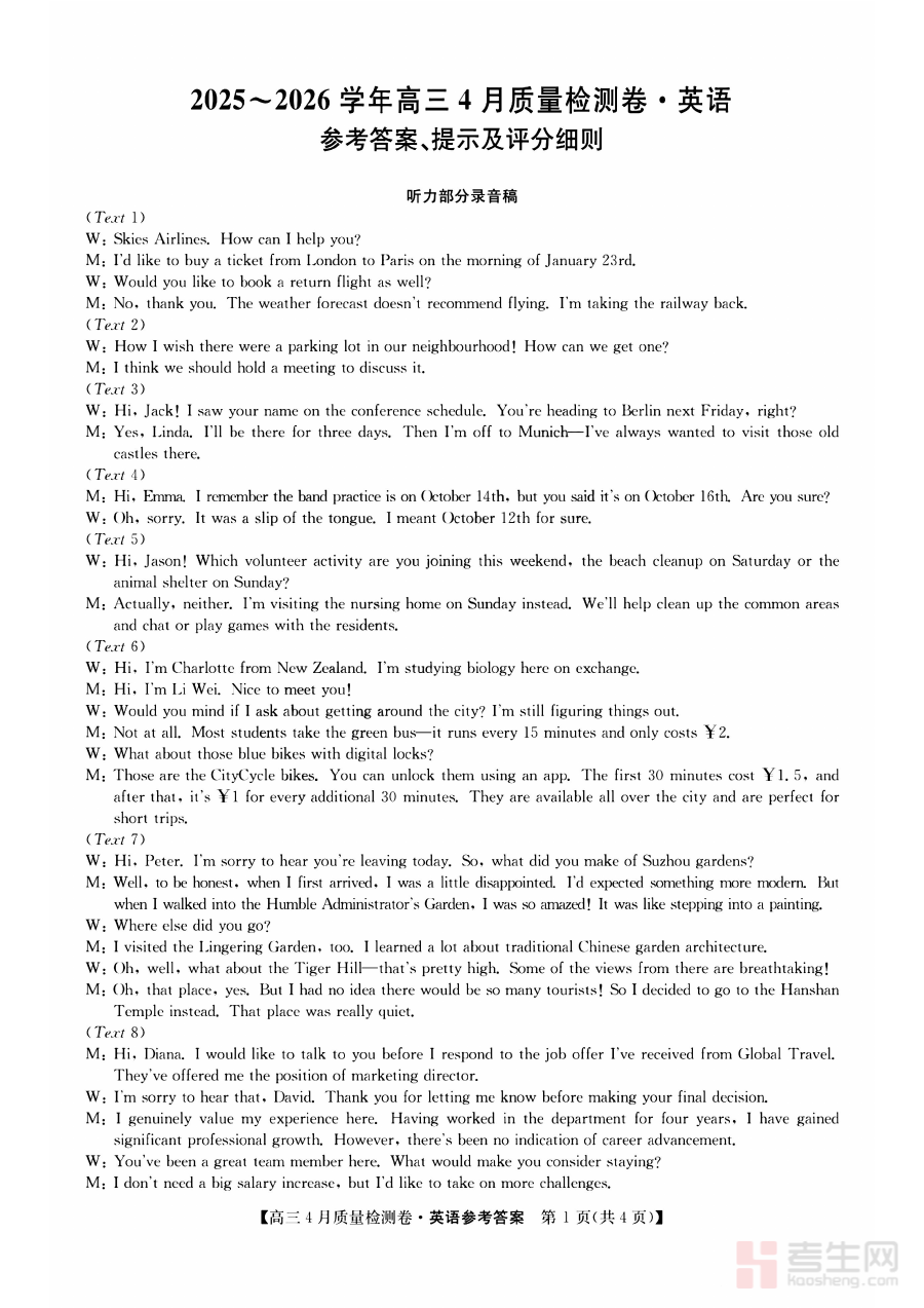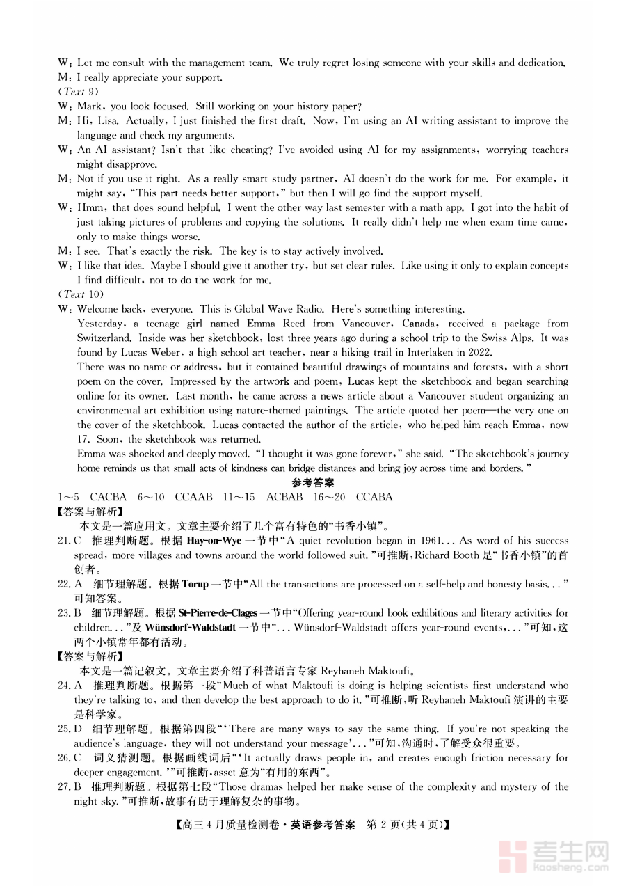 《山西省卓越联盟2025~2026学年高三4月质量检测卷 英语答案》是山西省卓越联盟在2025至2026学年针对高三年级学生组织的4月质量检测考试中,英语学科试卷对应的官方参考答案资料。该资料紧密贴合本次区域联盟阶段性检测的目标,旨在为考生和教学者提供精准的答案参考,是高三英语学科阶段备考过程中与检测卷配套使用的核心辅助材料之一。