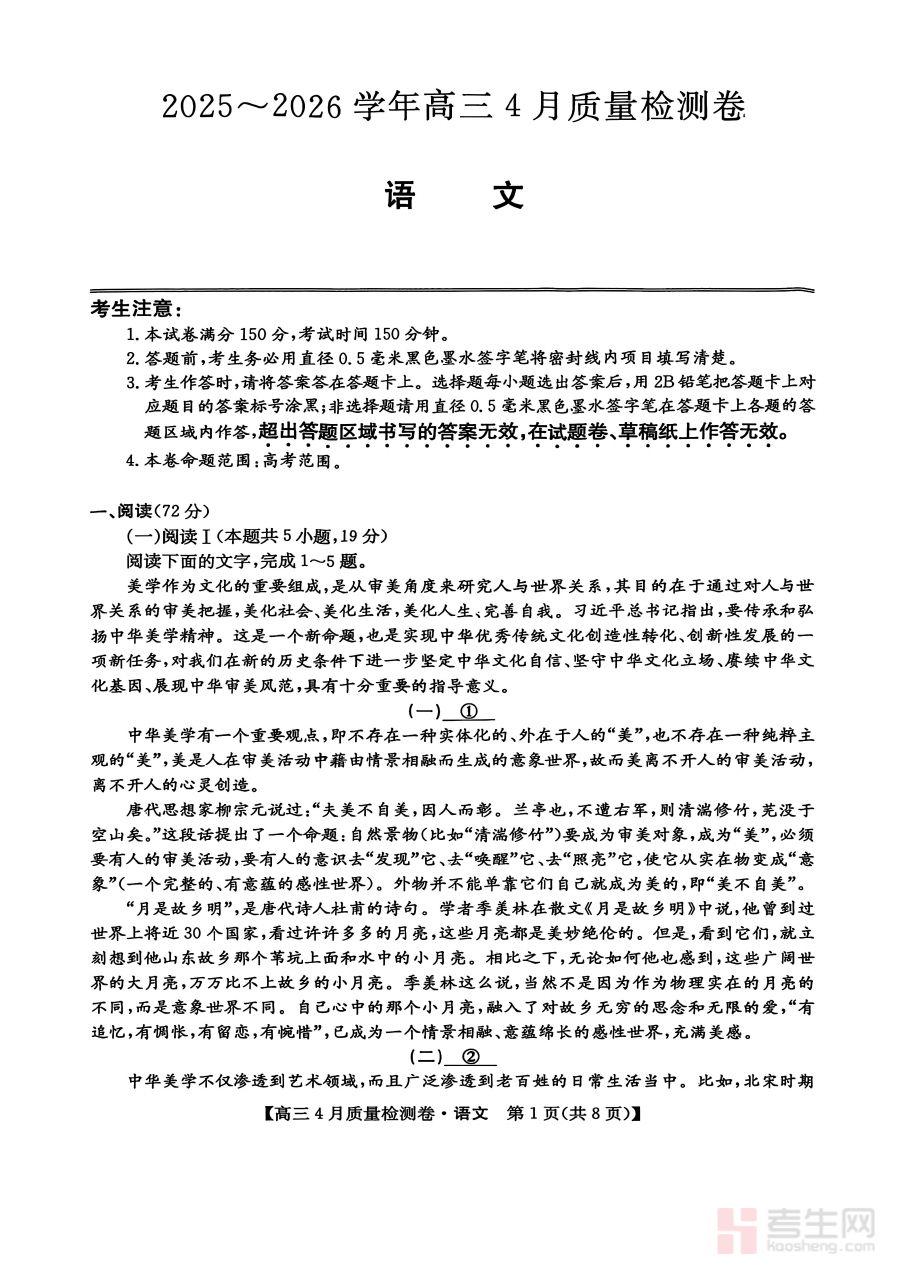 这份检测卷的主要用途在于实现精准学情诊断与科学备考规划指导。通过统一的检测流程与命题标准,教师可全面了解学生在语文学科各能力维度的表现,识别学习薄弱环节,从而调整后续教学策略与复习重点;学生则能通过检测结果清晰定位自身学习状态,明确后续复习方向与优先级,提升备考效率。同时,作为联盟内统一开展的检测活动,其结果也能为校际间教学质量对比与教研交流提供客观依据,推动联盟内教学资源共享与优化。