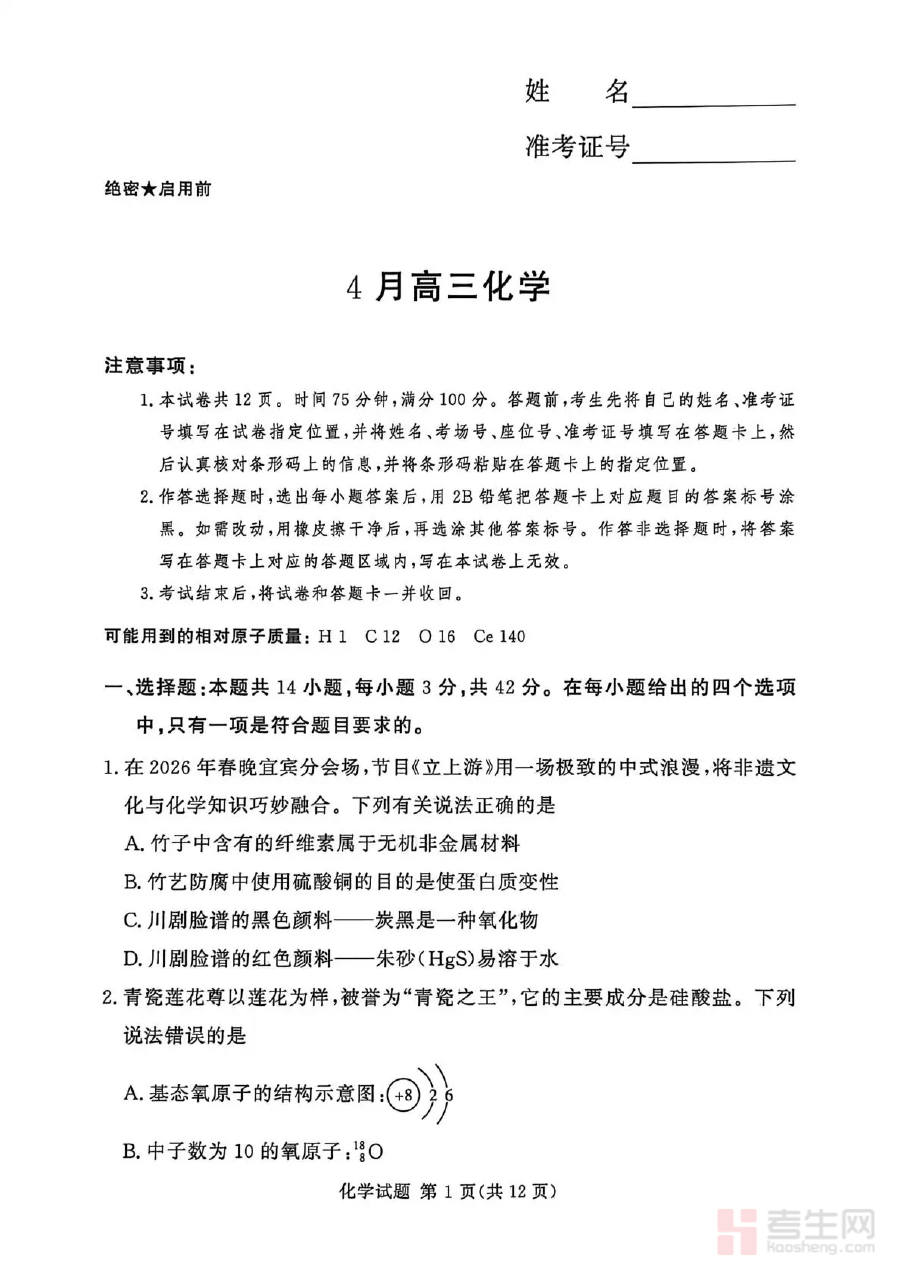《2025-2026学年高三下学期四月阶段检测 化学》是针对2025-2026学年高三学生在第二学期四月开展的化学学科阶段性检测资料,属于高三备考进程中关键节点的评估工具。该资料紧密贴合高三下学期的复习节奏,能够帮助使用者及时把握化学学科的阶段性学习成效,为后续的备考调整提供科学依据,助力师生在备考关键期精准定位学习状态。