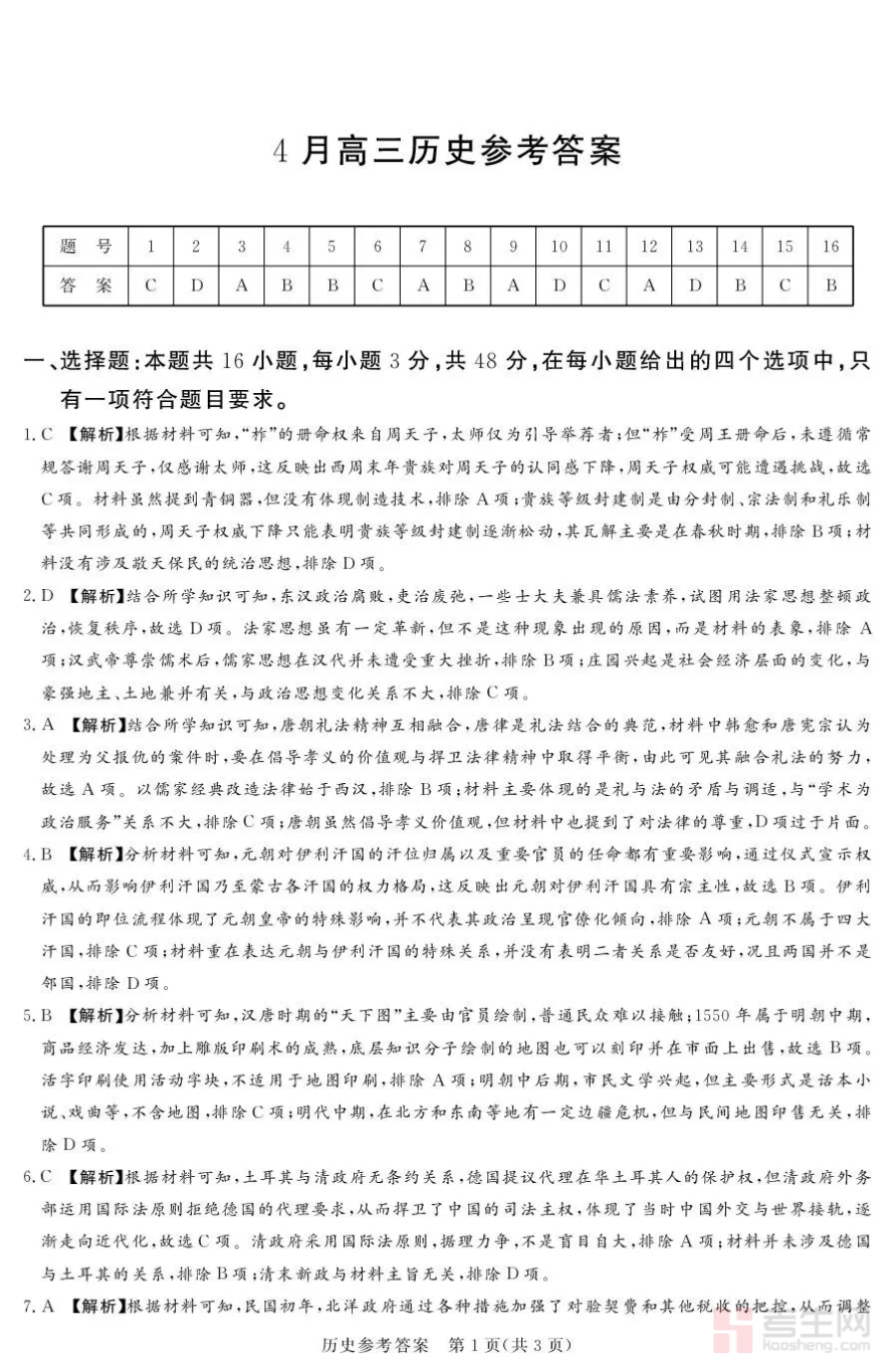 该资料的核心用途包括帮助考生快速核对四月阶段检测中的历史答题结果,清晰识别自身在历史知识掌握上的薄弱环节与易错点;同时辅助教师开展学情诊断工作,全面了解学生群体在该阶段历史学习中的整体情况与共性问题,为后续教学计划的调整以及备考策略的优化提供数据支撑与方向指引。