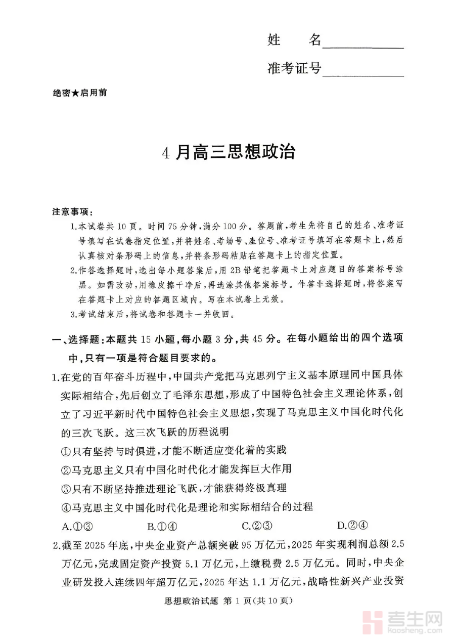本资料适用于2025-2026学年高三年级政治学科的学生及任课教师,作为四月阶段检测的关键资料,其核心价值在于通过规范的阶段性检测强化知识掌握程度,提升学生的应试技巧与综合能力,同时为教师优化教学计划、实施针对性辅导提供参考依据。