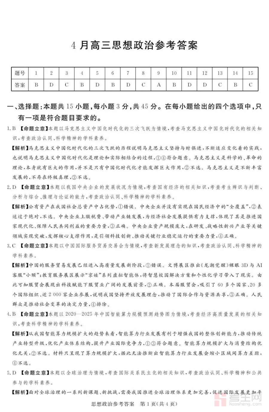 《2025-2026学年高三下学期四月阶段检测 政治答案》是2025-2026学年高三下学期四月阶段检测的配套政治学科答案资料,属于高三年级阶段性教学评估的重要组成部分。该资料与同期阶段检测试题紧密对应,为高三师生提供准确的参考答案依据,助力及时掌握本次检测的结果情况。它依托高三下学期四月这一关键备考节点,衔接一轮复习与后续冲刺阶段,帮助相关人员快速了解检测的整体方向和评价标准,是阶段性教学反馈的核心参考资料之一。