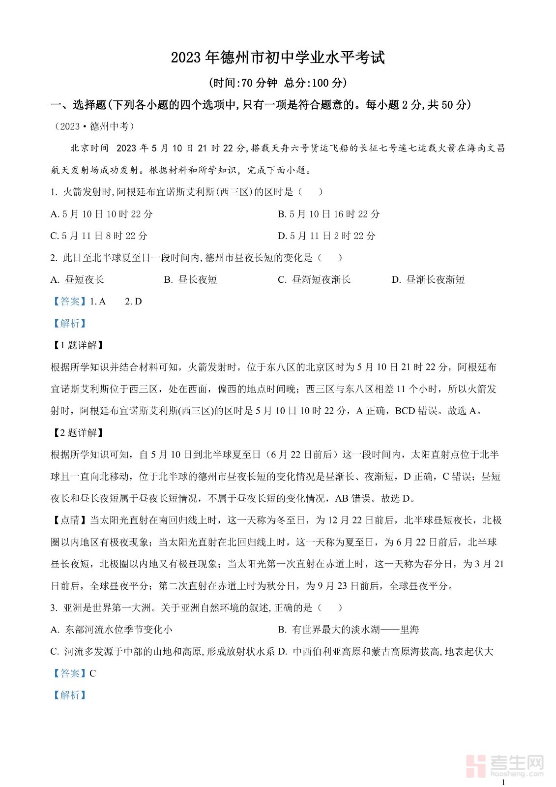 2023年山东省德州市中考地理真题 (解析版)