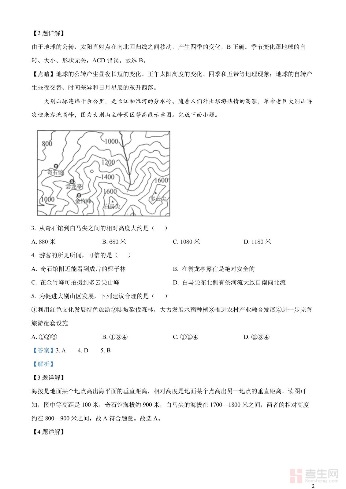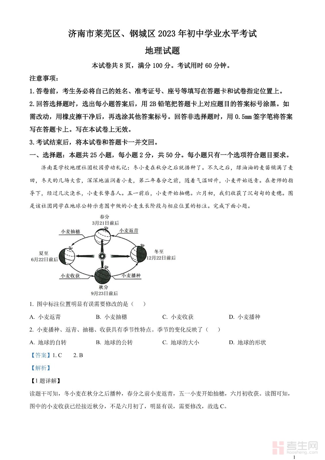 2023年山东省济南市莱芜区、钢城区中考地理真题(解析版)