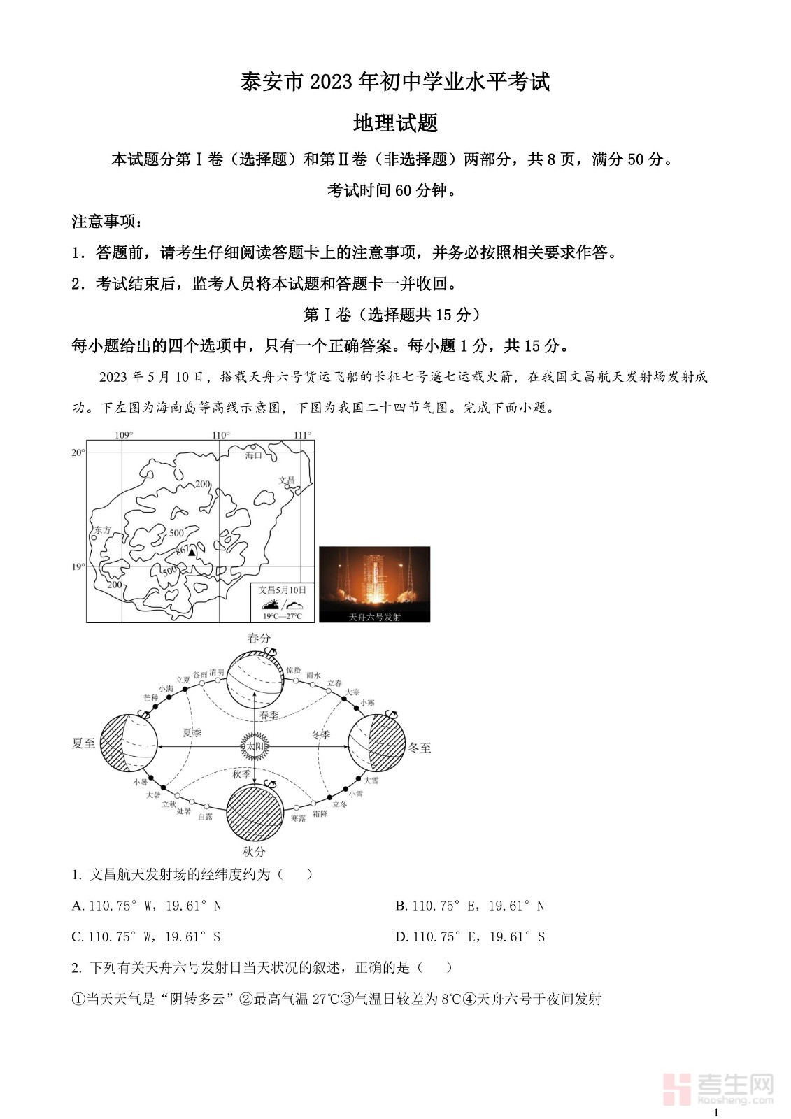 2023年山东省泰安市中考地理真题(原卷版)