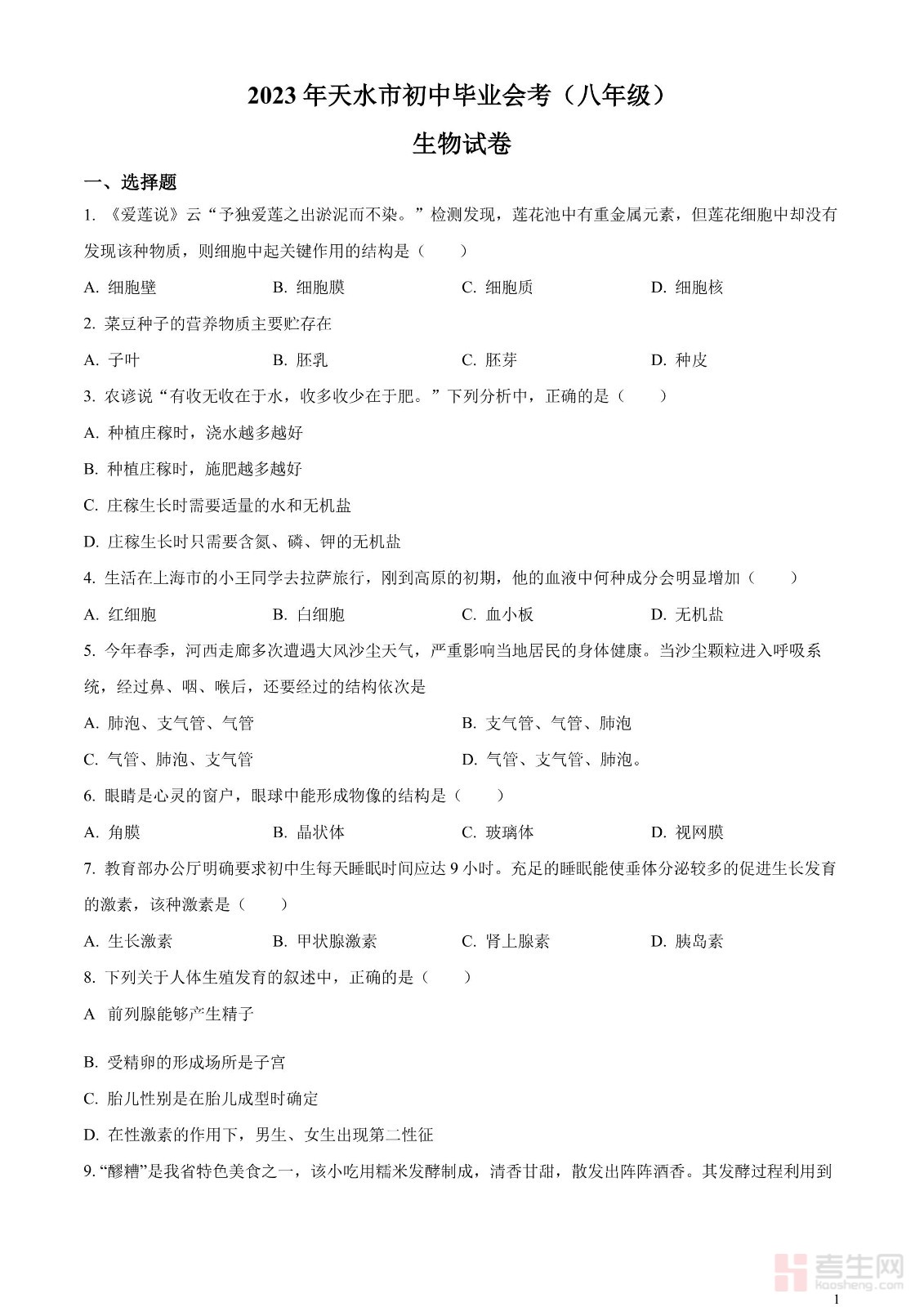 2023年甘肃省天水市中考生物真题(原卷版)