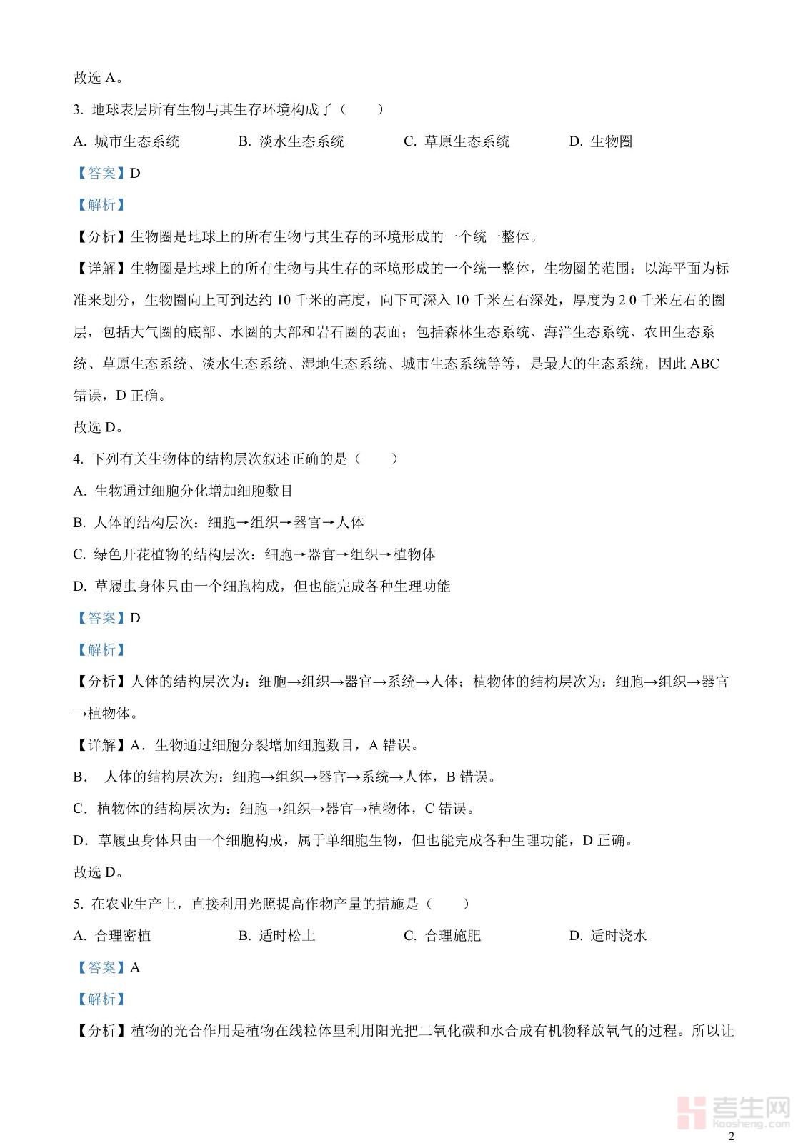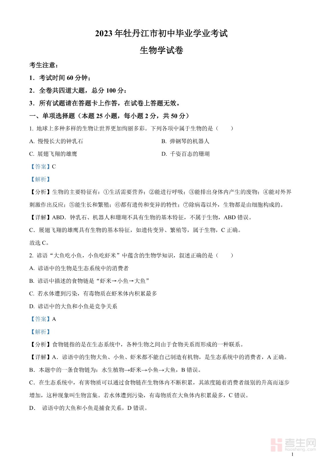 2023年黑龙江省牡丹江市中考生物真题(解析版)
