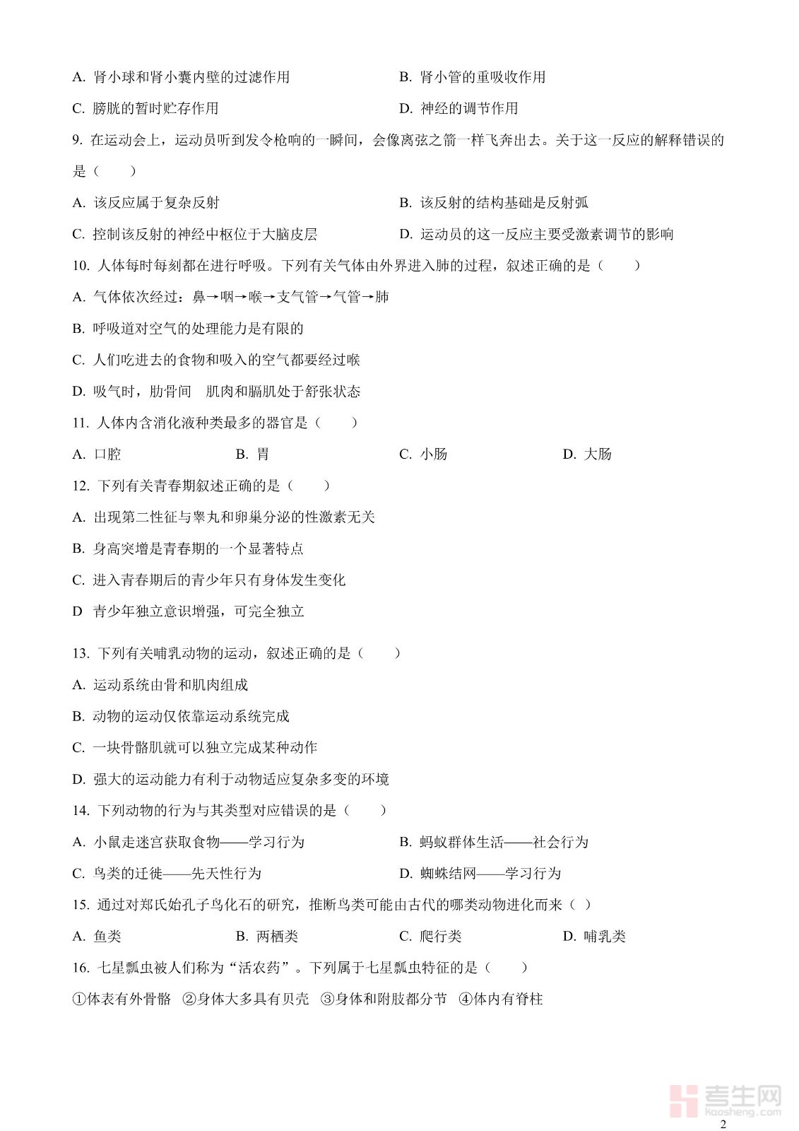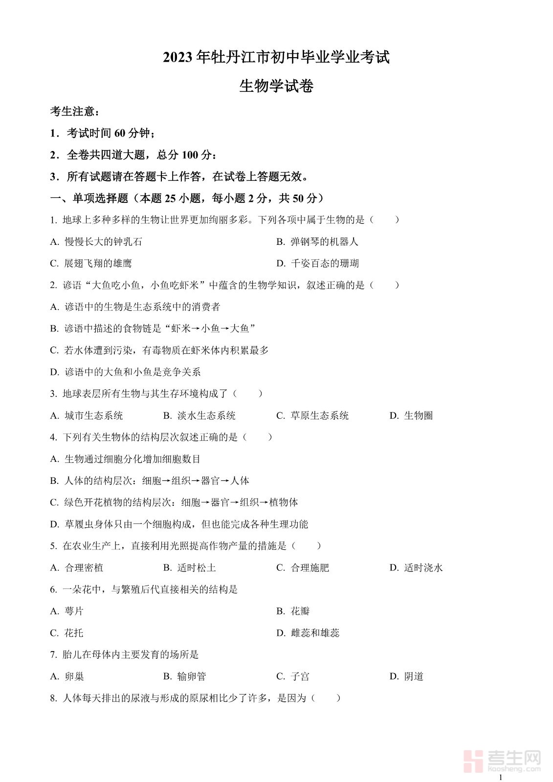 2023年黑龙江省牡丹江市中考生物真题(原卷版)