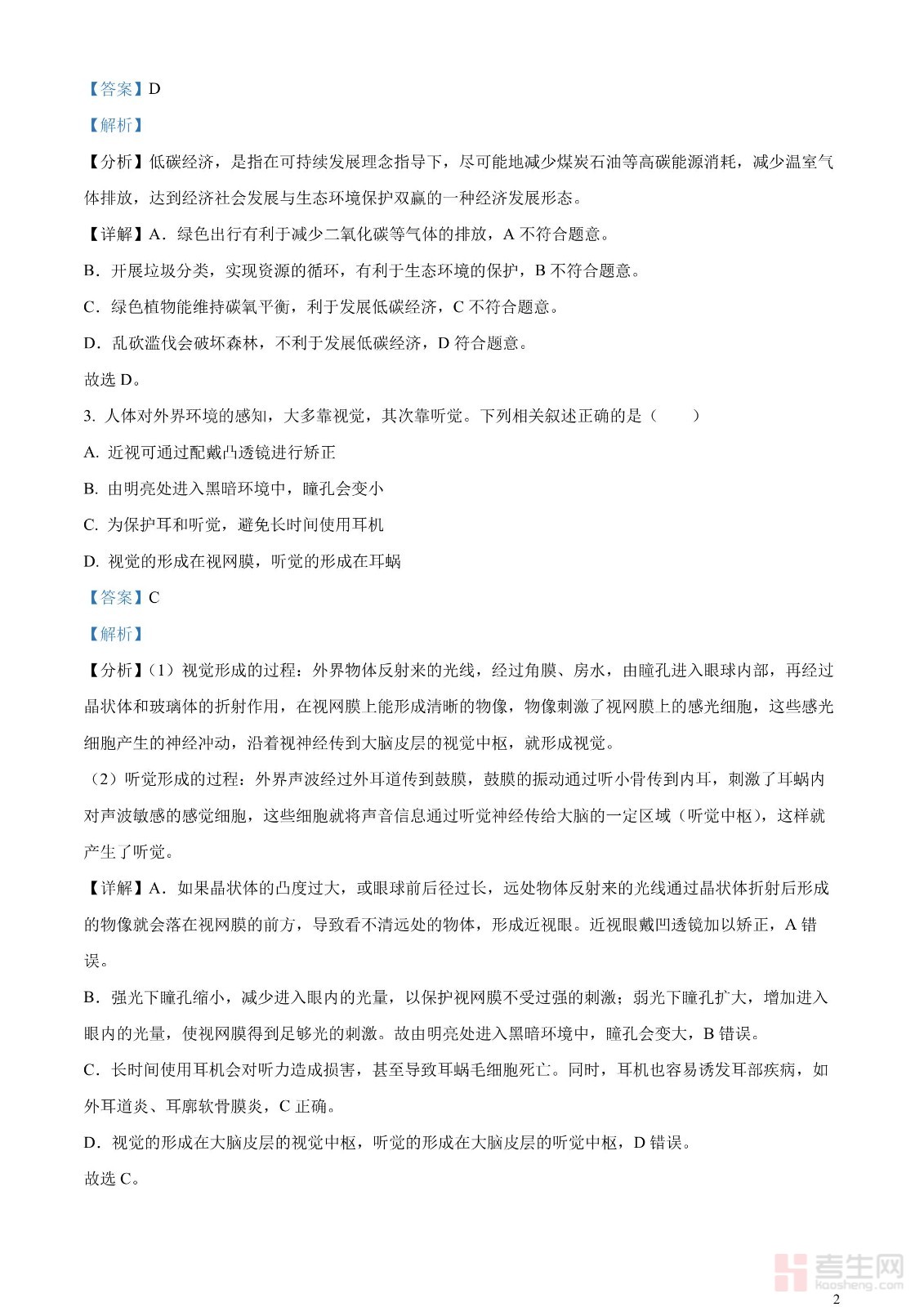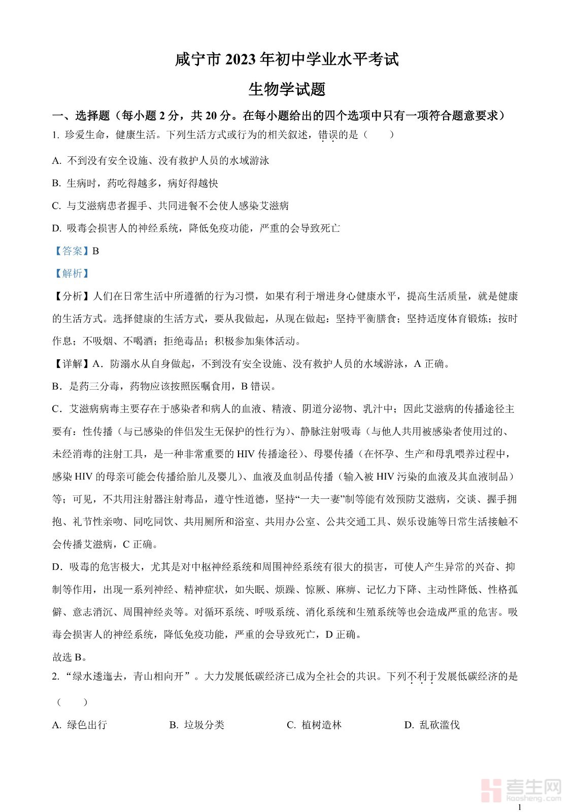 2023年湖北省黄冈市孝感市咸宁市生物中考真题试题(解析版)