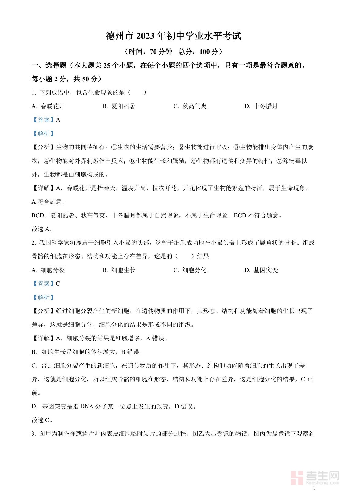 2023年山东省德州市中考生物试题(解析版)