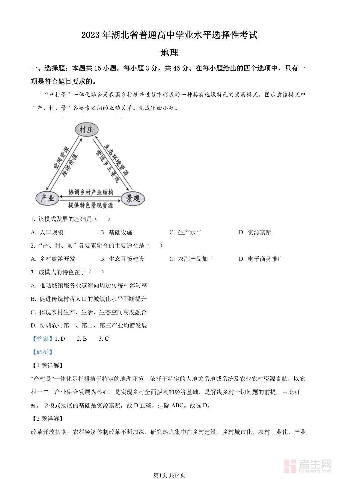 2023年高考地理试卷(湖北)(解析卷)