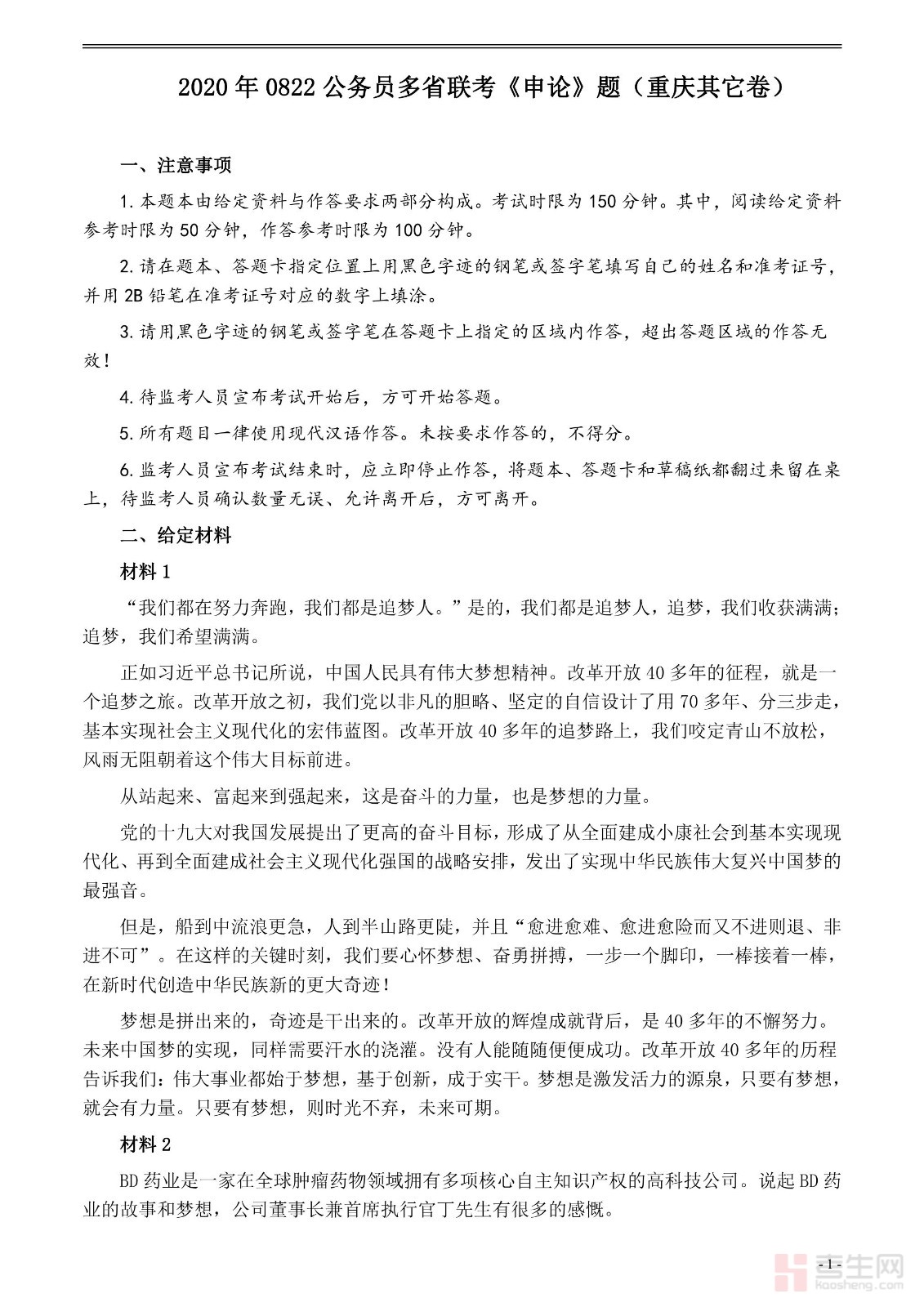 2020年0822公务员多省联考《申论》题(重庆一卷)及参考答案