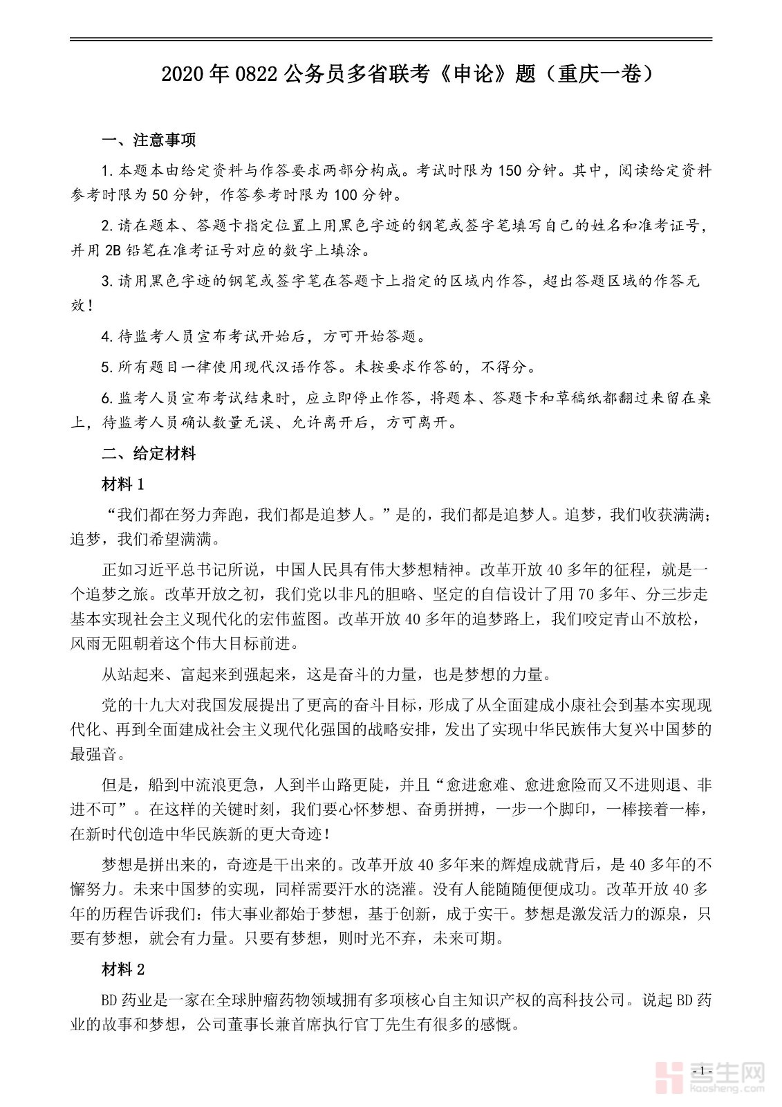 2020年0822公务员多省联考《申论》题(重庆一卷)及参考答案