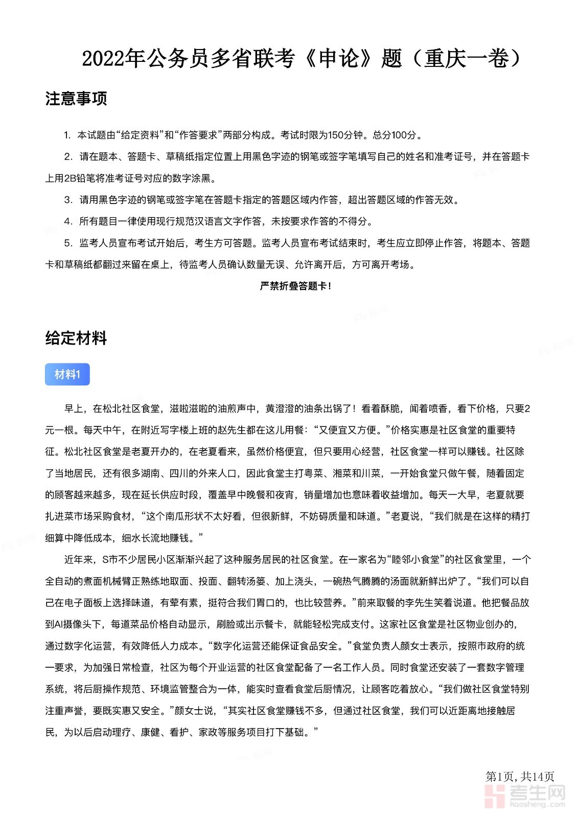 2022年0709公务员多省联考《申论》题(重庆一卷)及参考答案