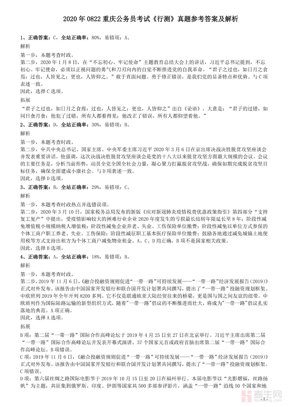 2020年0822重庆公务员考试《行测》真题参考答案及解析