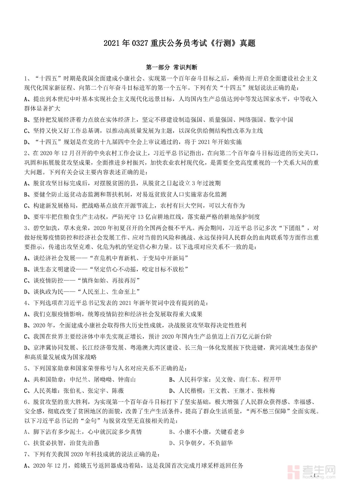 2021年0327重庆公务员考试《行测》真题参考答案及解析