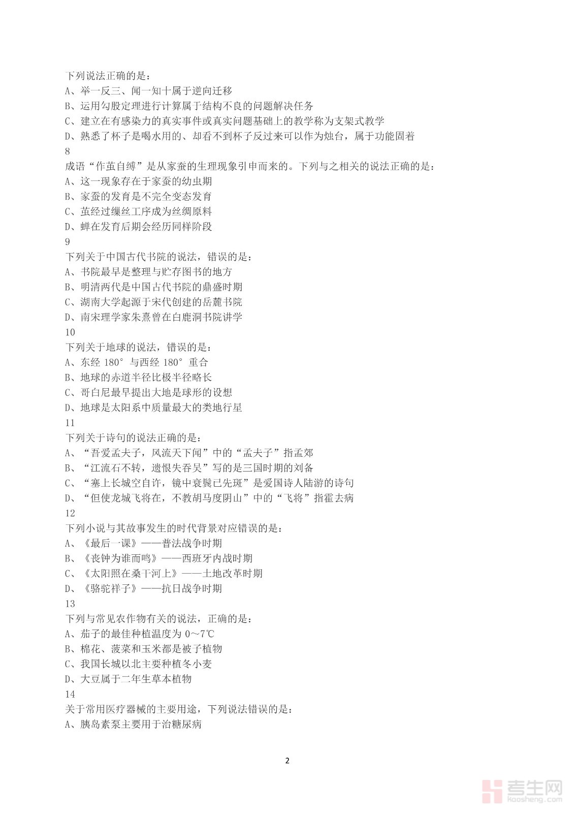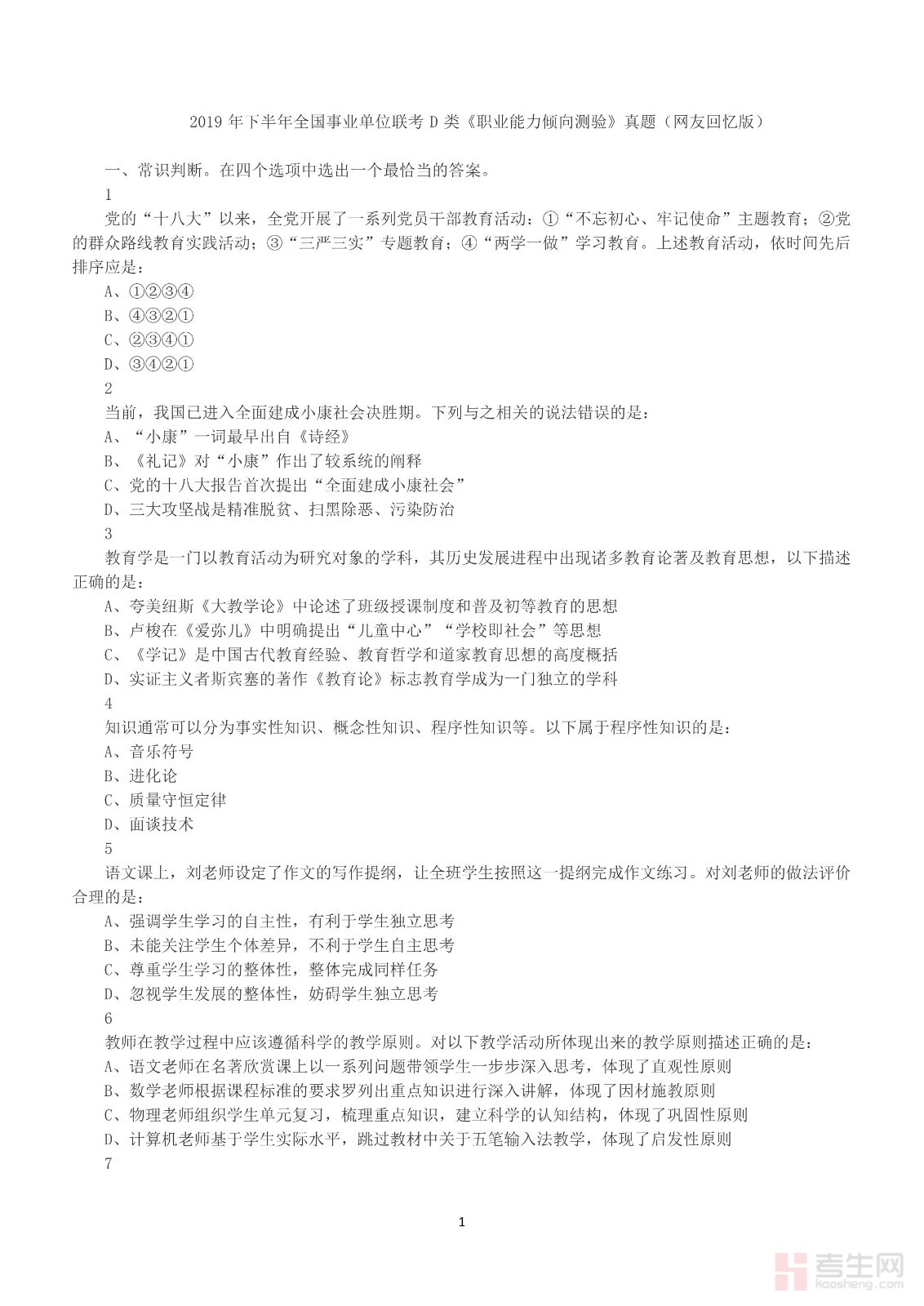 2019年下半年全国事业单位联考D类《职业能力倾向测验》试题