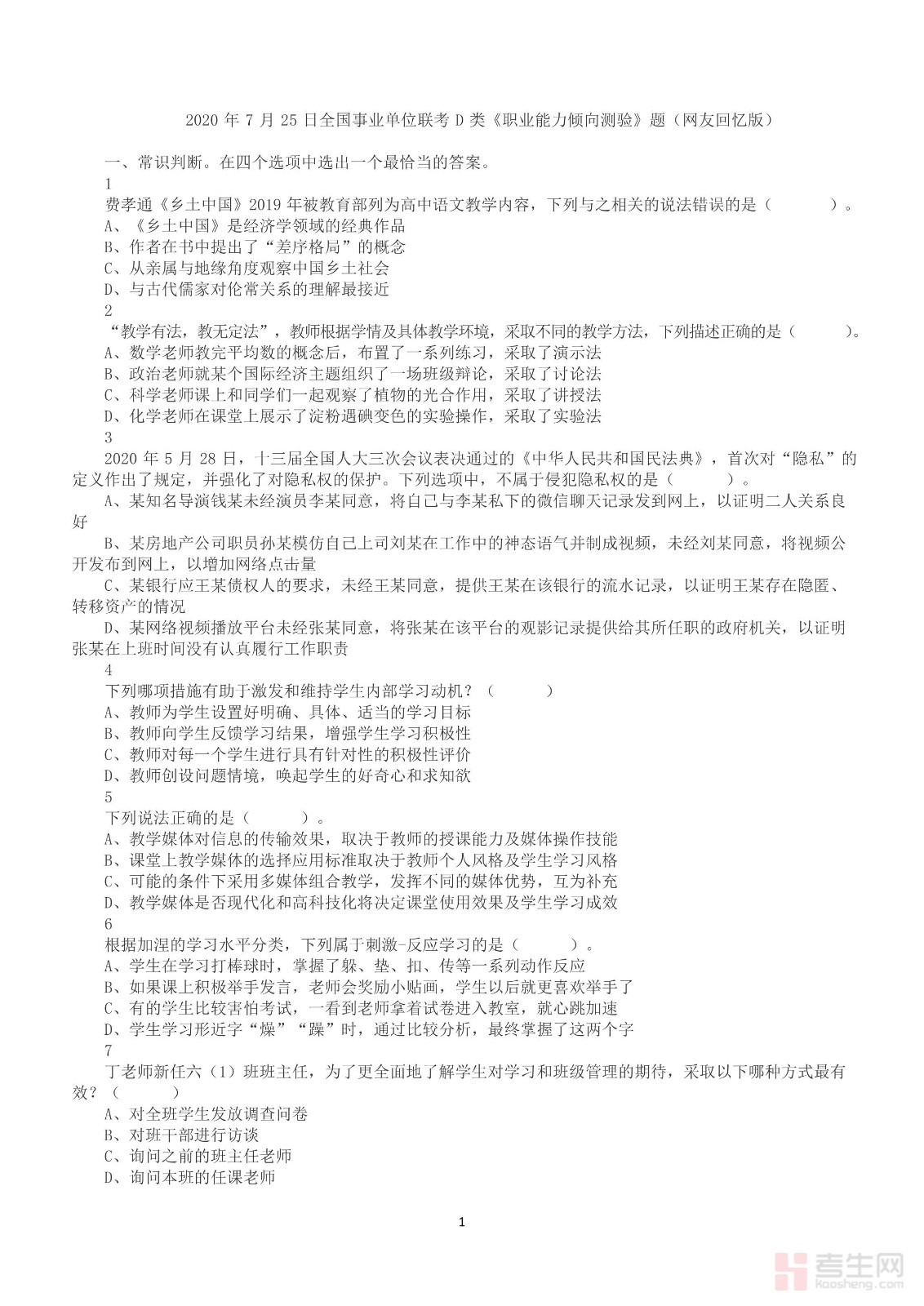 2020年7月25日全国事业单位联考D类《职业能力倾向测验》试题