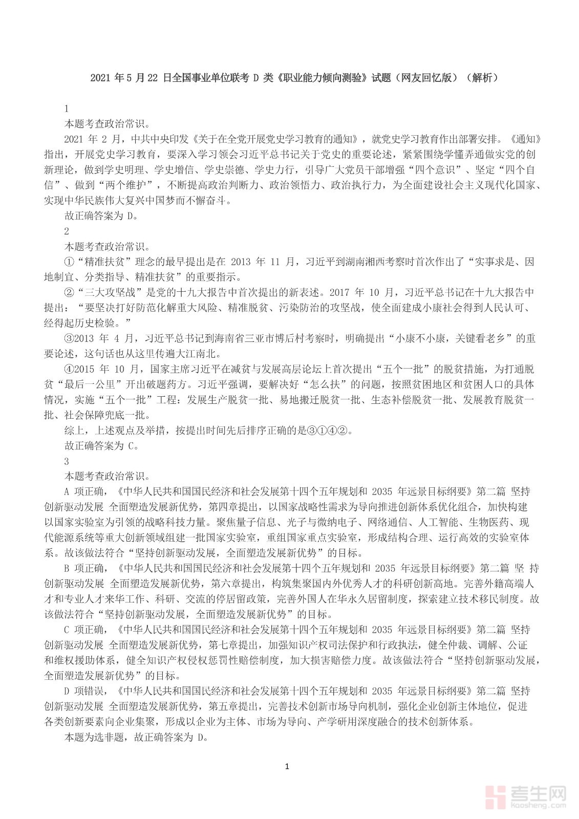 2021年5月22日全国事业单位联考D类《职业能力倾向测验》答案+解析