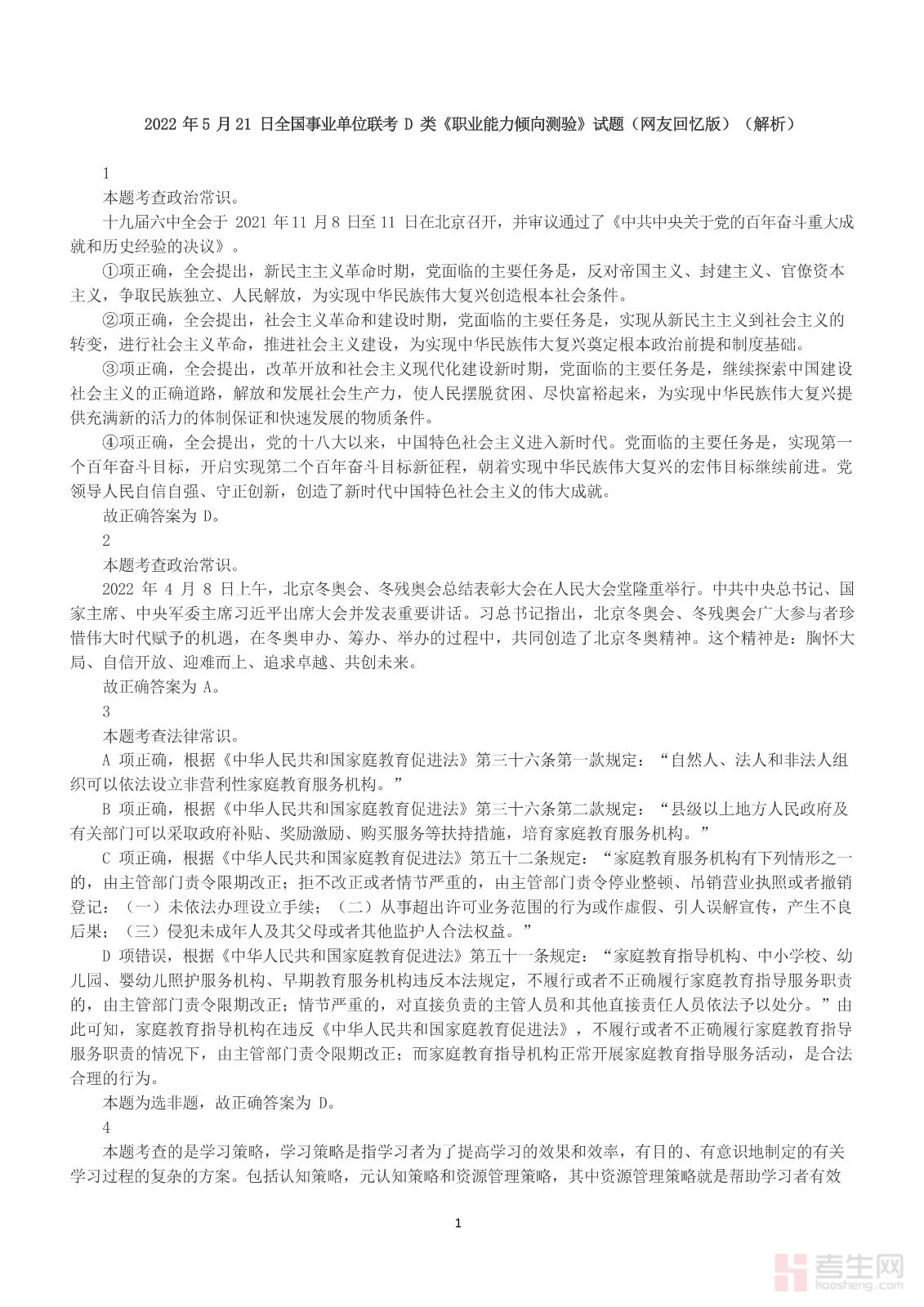 2022年5月21日全国事业单位联考D类《职业能力倾向测验》答案+解析