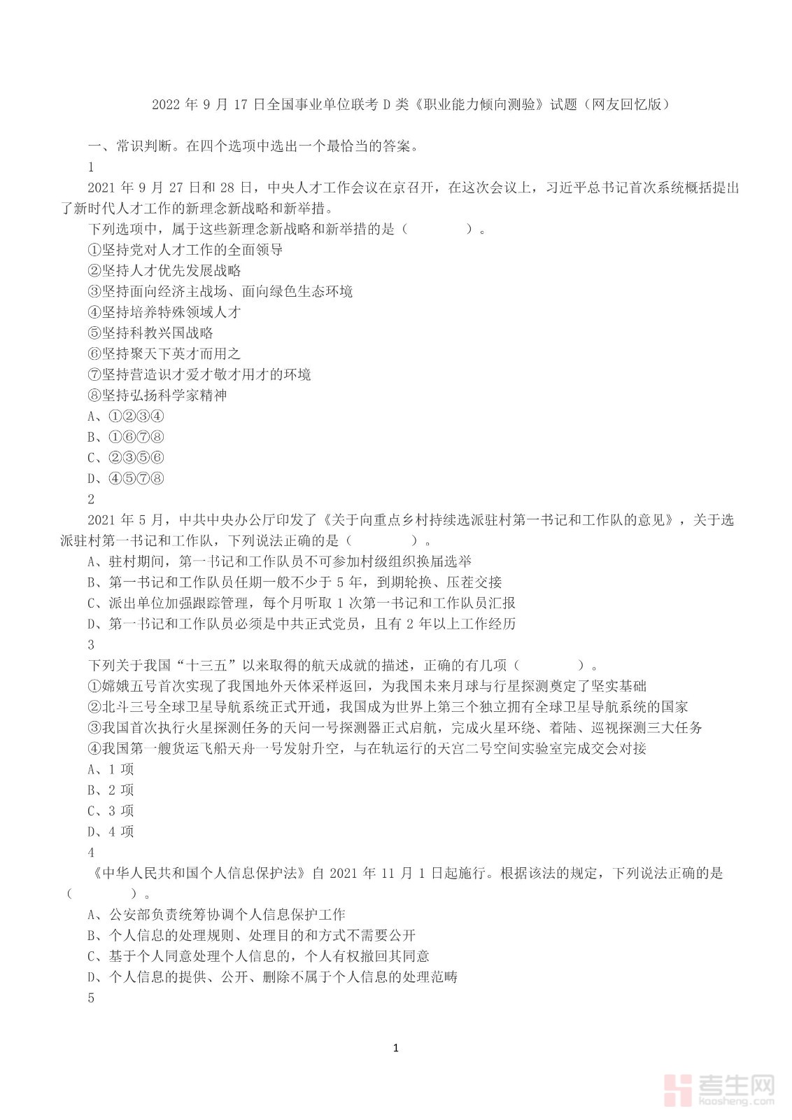2022年9月17日全国事业单位联考D类《职业能力倾向测验》试题