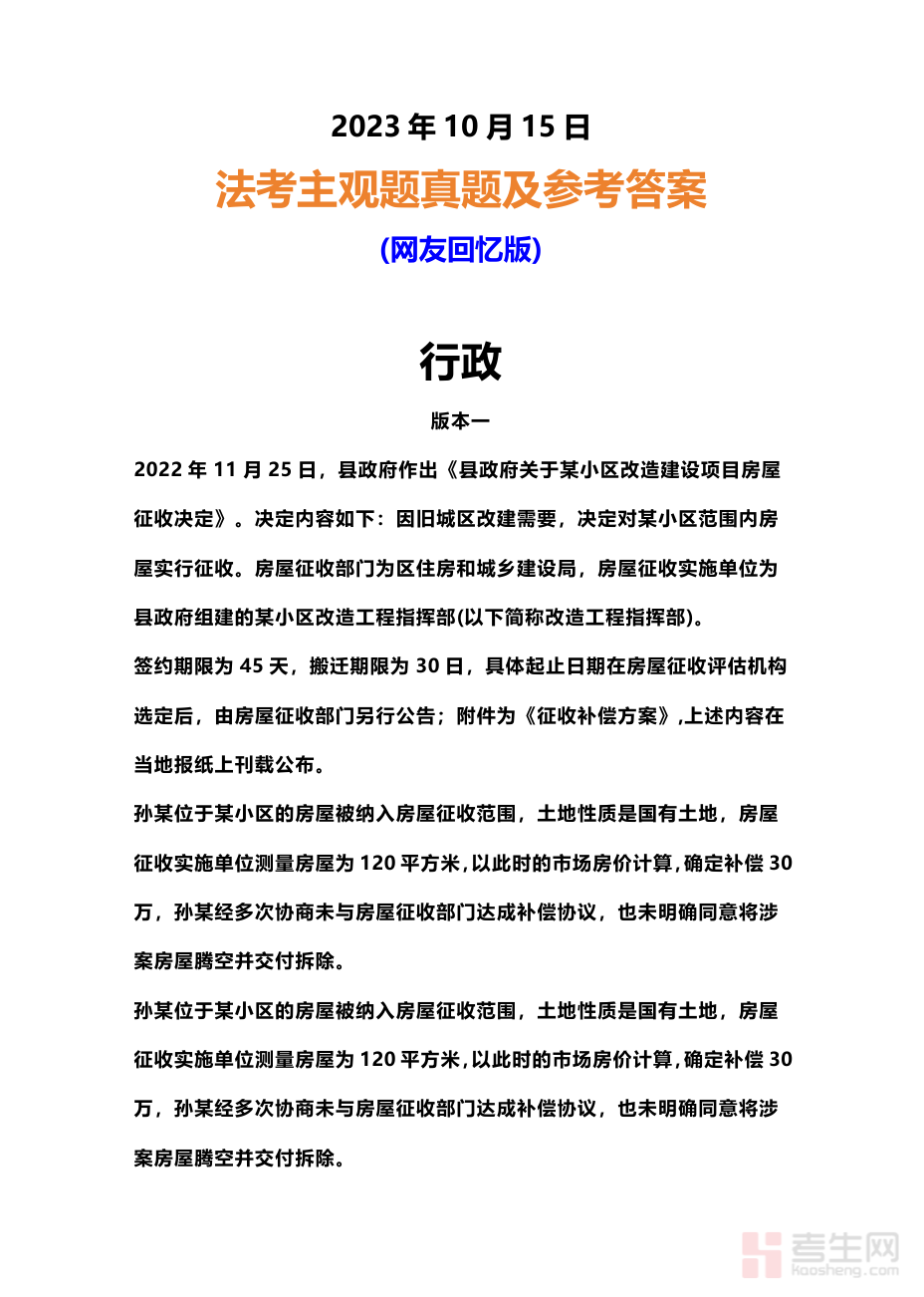 2023年10月15日法考主观题真题附答案(行政)