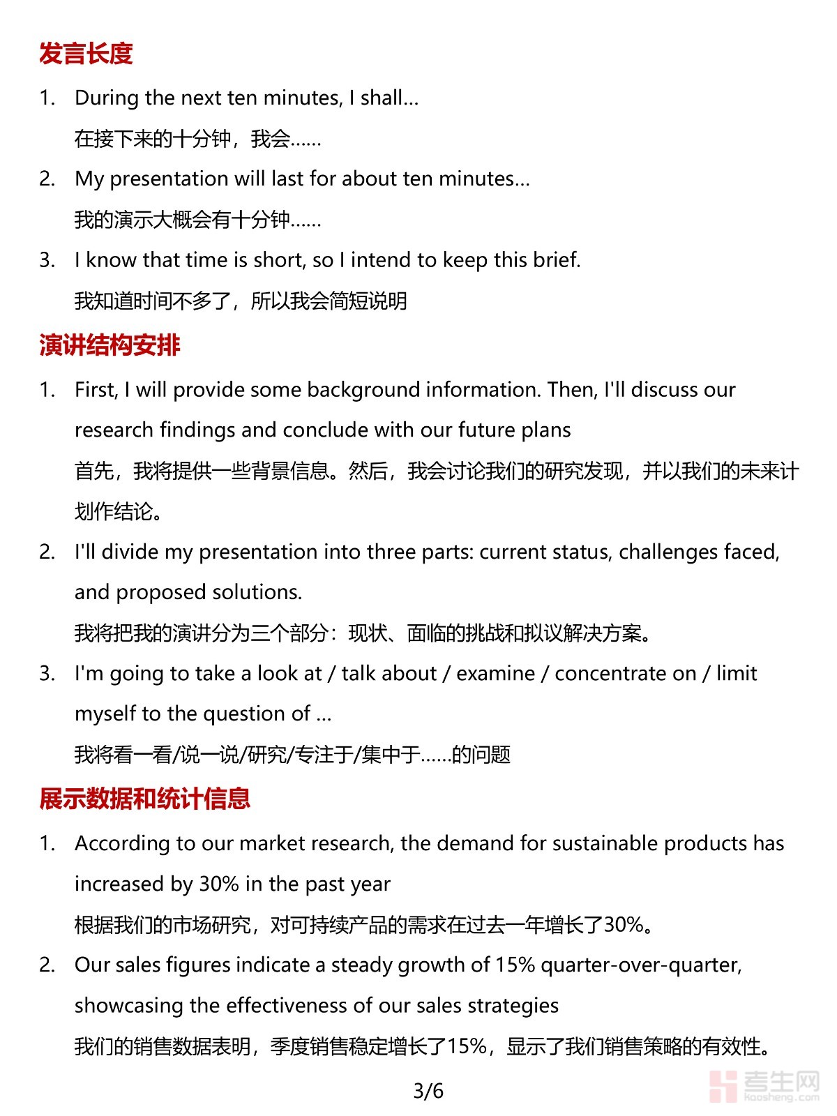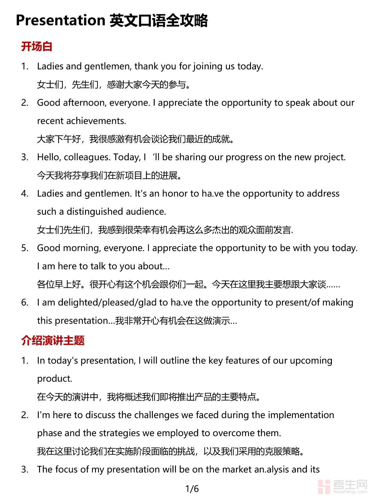 无论是学术报告、商务演讲,还是日常汇报,流利的英文口语都能让你的表达更加自信、专业!今天我为大家带来了超实用的“Presentation 英文口语全攻略”资料,让你轻松驾驭任何演讲场合!