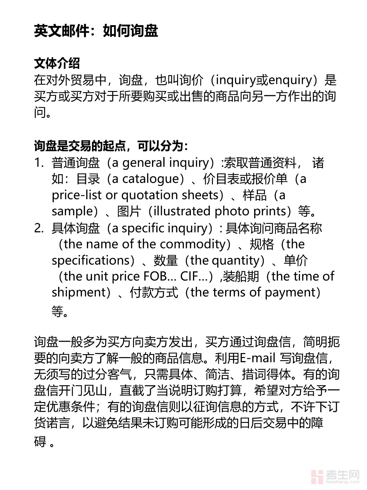 在商务谈判中,如何通过邮件清晰、精准地询问产品或服务信息是至关重要的!今天我为大家带来了“英文邮件:如何询盘”的资料,让你轻松应对各种询盘邮件,提升职场沟通能力!