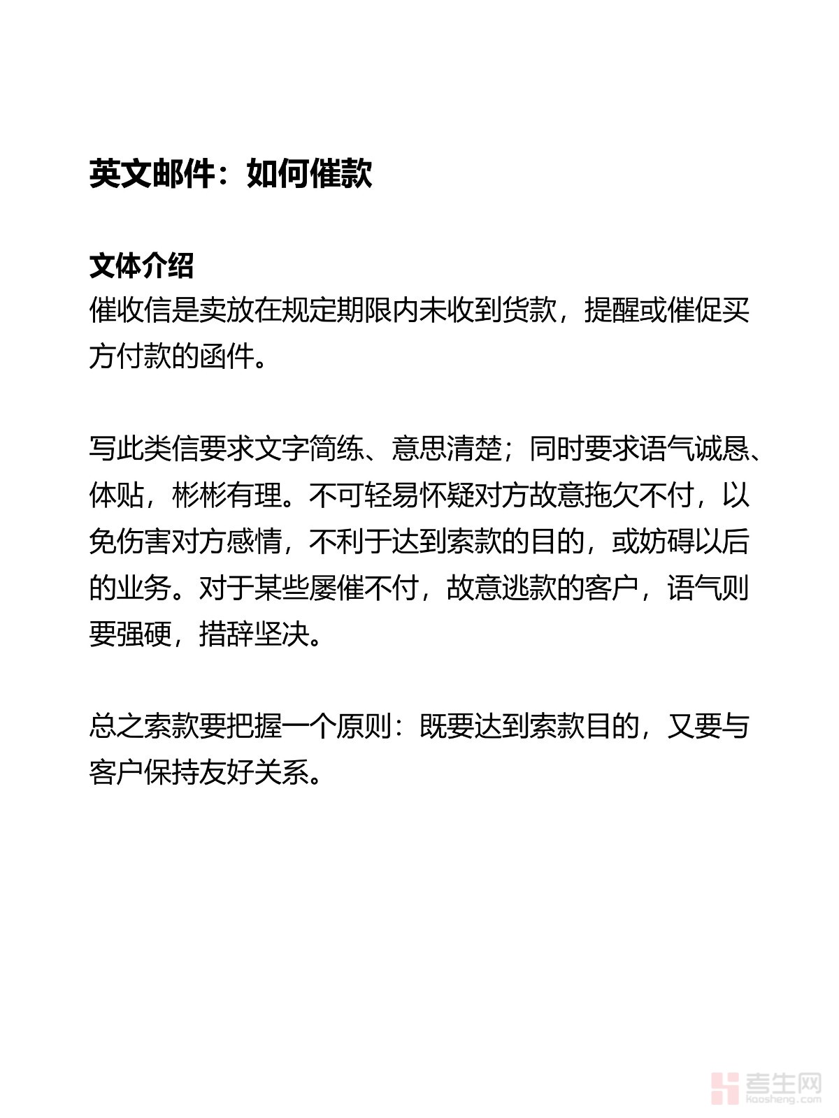 在商务往来中,催款邮件是不可或缺的一部分,如何写得专业又不失礼呢?今天我为大家准备了一份“英文邮件:如何催款”的资料,帮助你轻松处理催款事宜,提升职场沟通能力!
