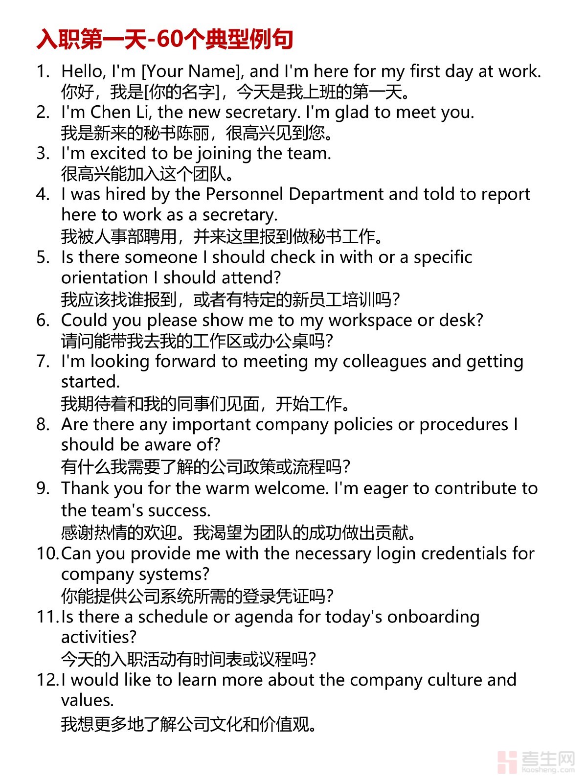 刚入职第一天,不知道怎么用英文打招呼、介绍自己、问问题、求帮助?这份「入职第一天 · 60个必备英文句型」就是为你准备的职场“语言急救包”!帮你自然开口、不怯场,快速融入职场环境!
