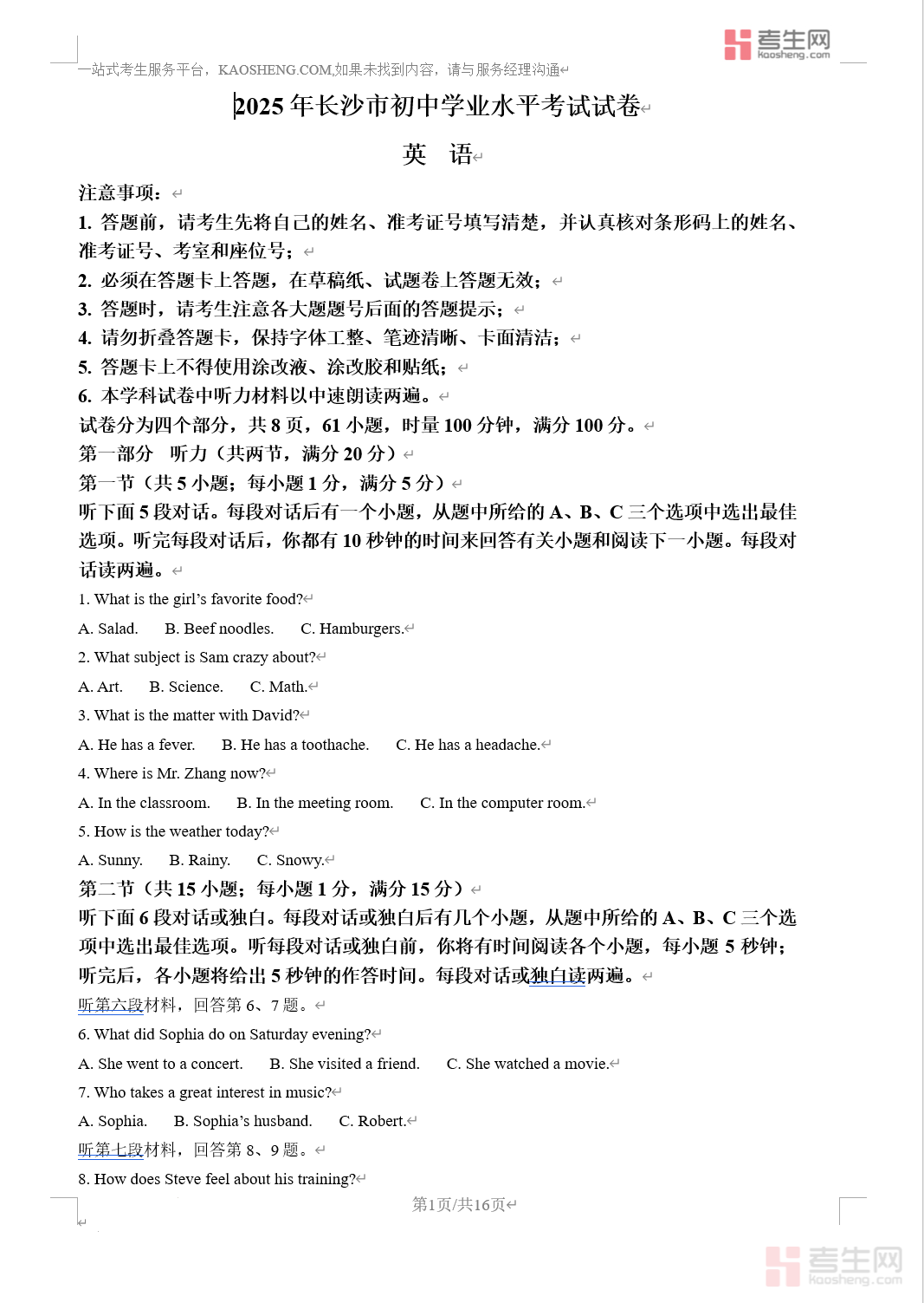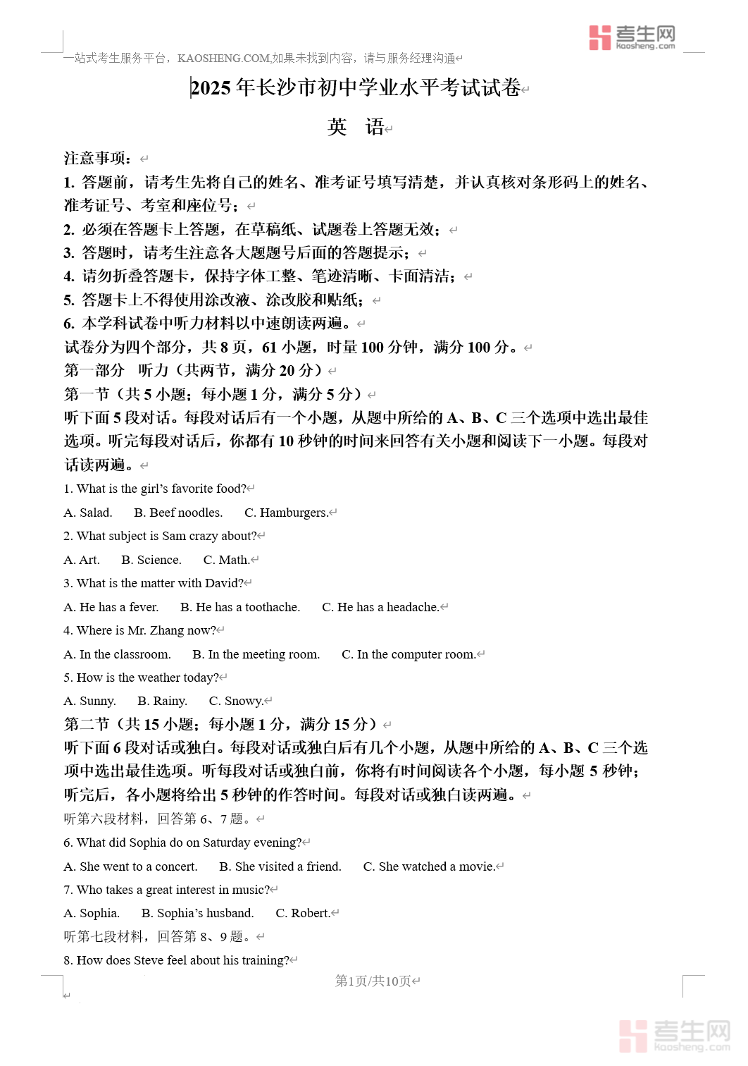 2025年湖南省长沙市中考英语真题原卷版+解析版+听力音频