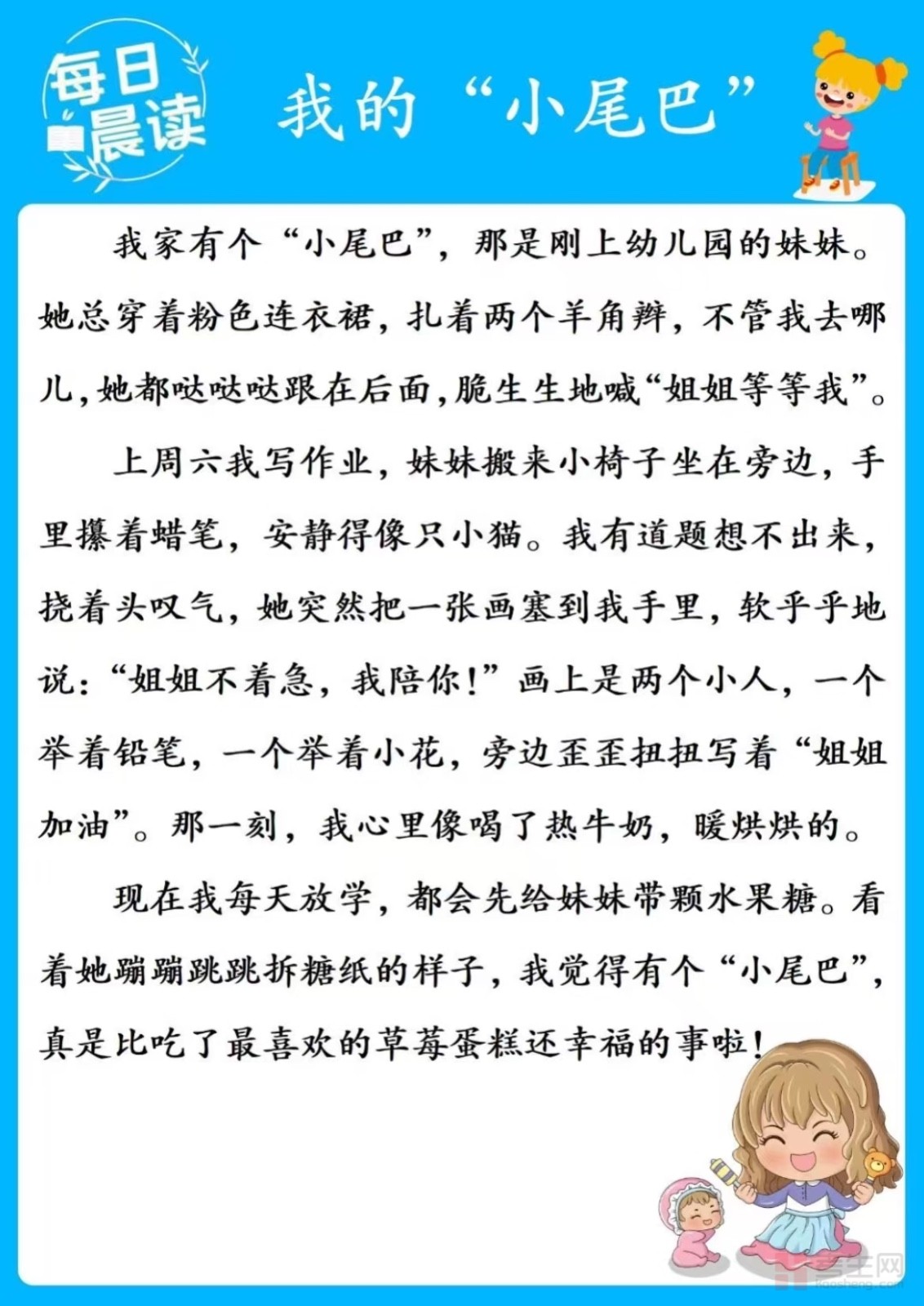 无论哪种 “小尾巴”,文字中都藏着 “双向的温暖”——“我” 会教 “小尾巴” 系鞋带,耐心纠正它的小错误;会在它害怕时把它护在身后,轻声安慰 “别怕,有我呢”;也会在它带来小惊喜(比如画的歪脸画像、捡来的小石子)时,认真收下这份 “礼物”,看着它笑弯的眼睛,自己心里也满是柔软。这些场景不仅能让你在晨读时积累 “亲情”“友情”“陪伴” 主题的写作素材,学习 “细节描写 + 情感融入” 的手法,更能唤醒你对身边 “小尾巴” 的记忆与共鸣,感受那份不掺杂质的温暖。