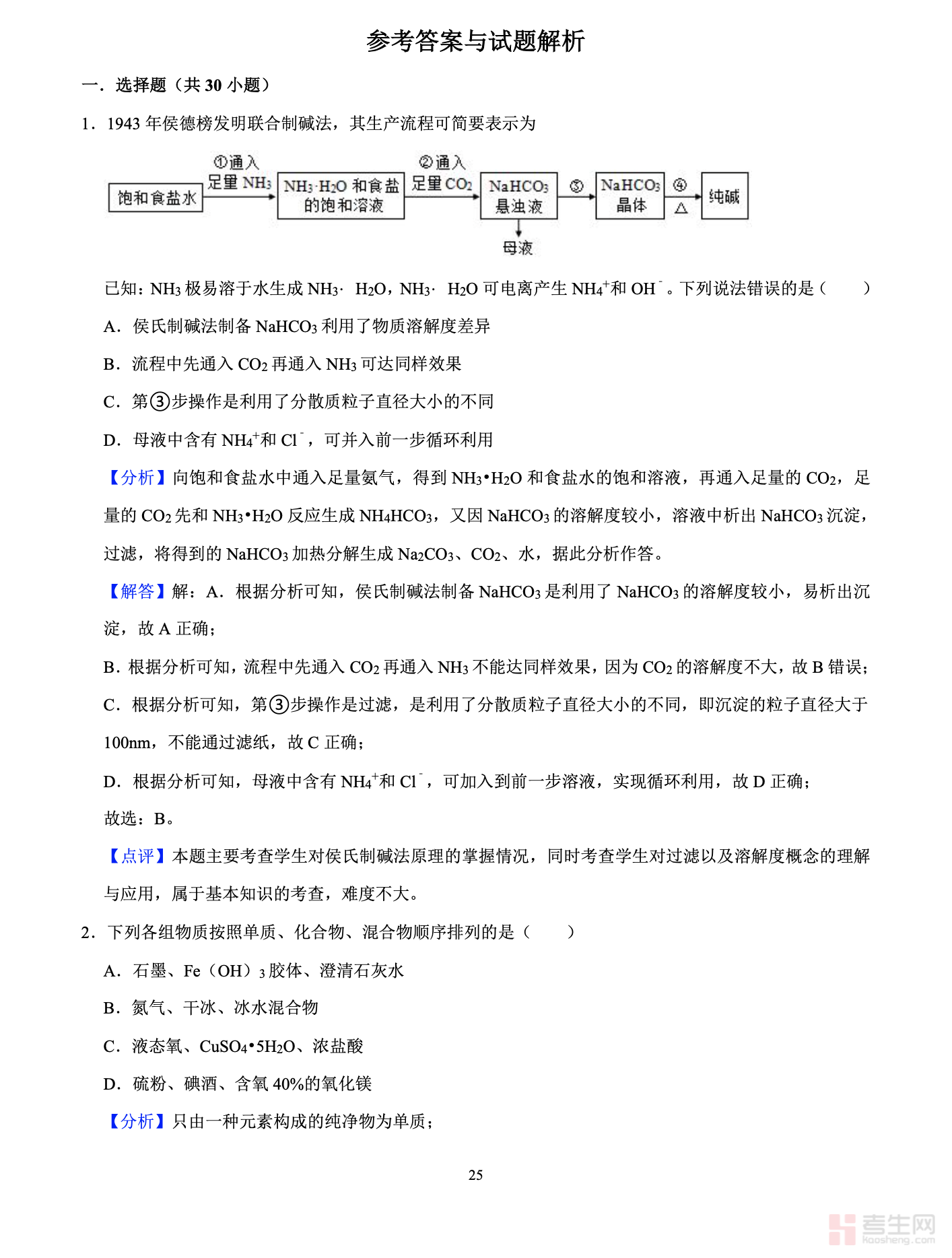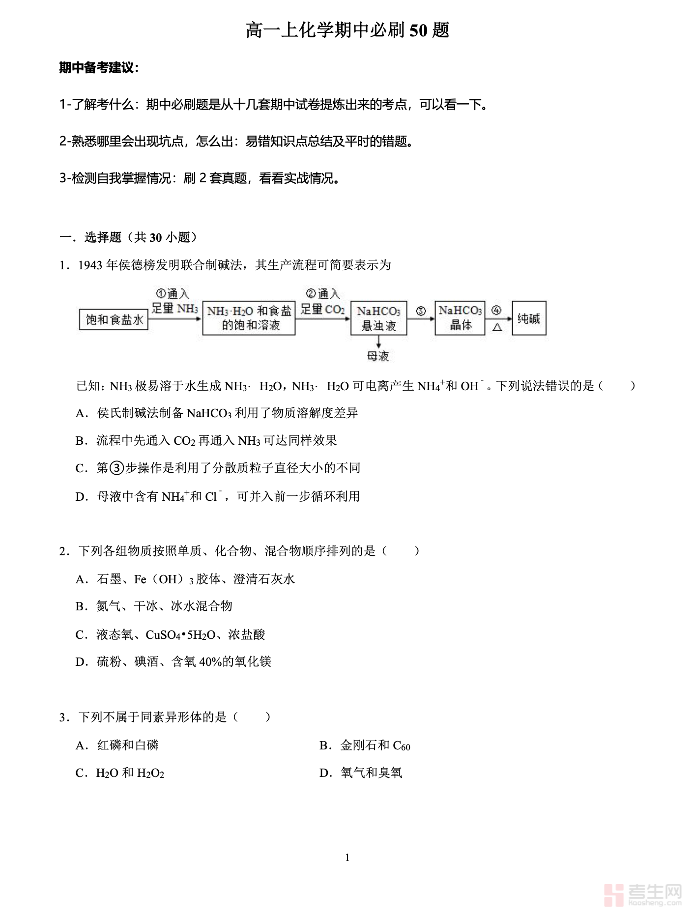 高一上化学期中必刷50题(含答案解析)