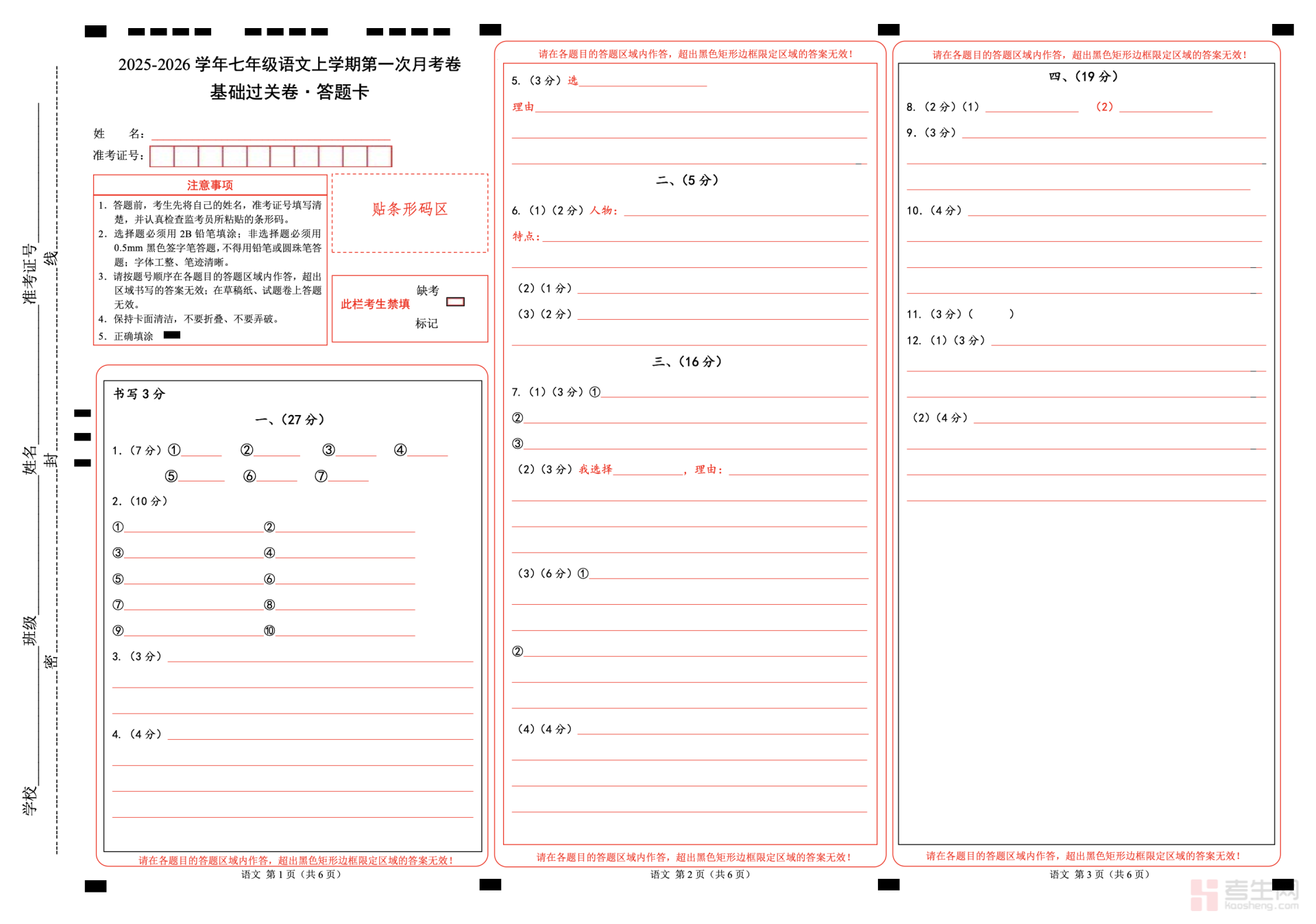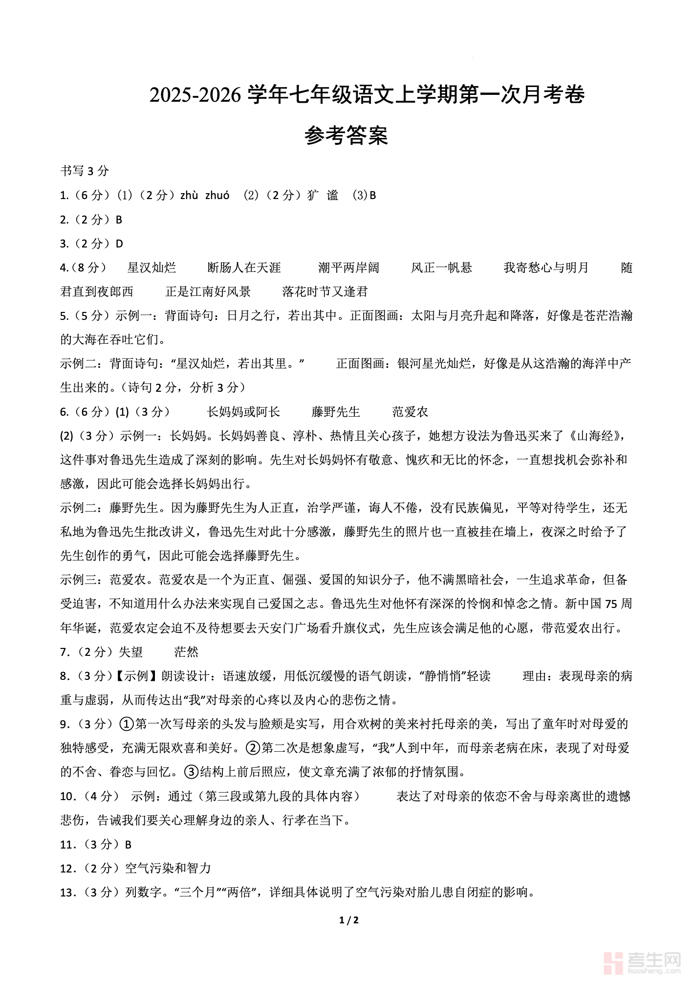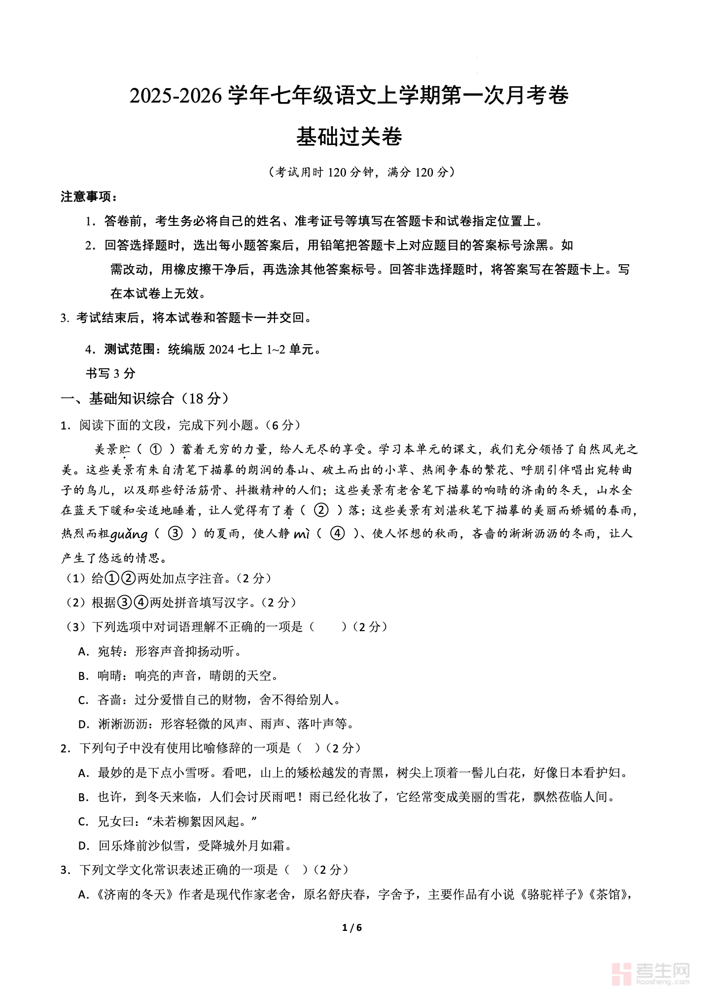 七年级语文第一次月考卷·基础过关卷(考试版A4)【测试范围:上册第1-2单元】(含答案解析)