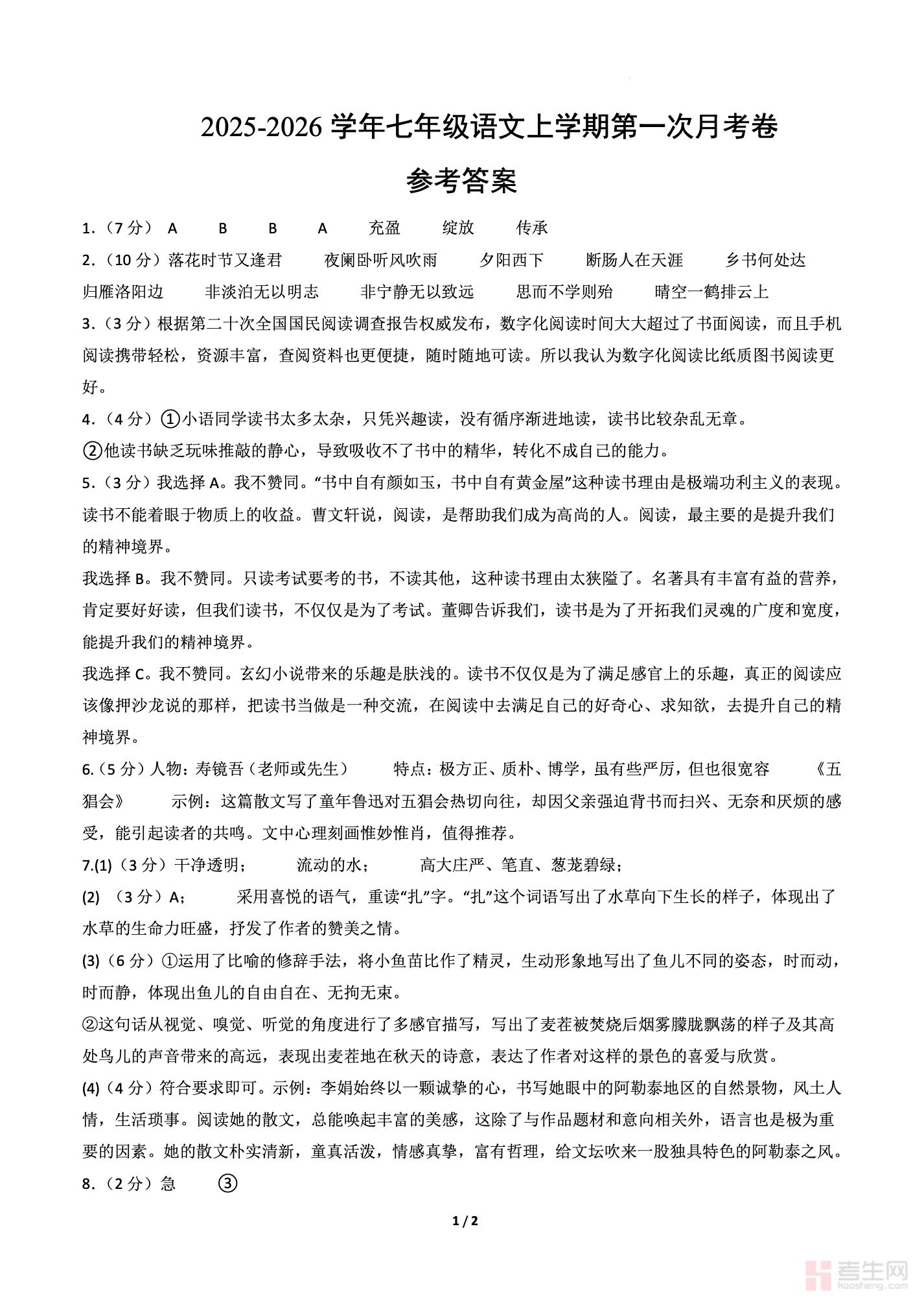 七年级语文第一次月考卷·重难突破卷(考试版A4)【测试范围:上册第1-2单元】(含答案解析)