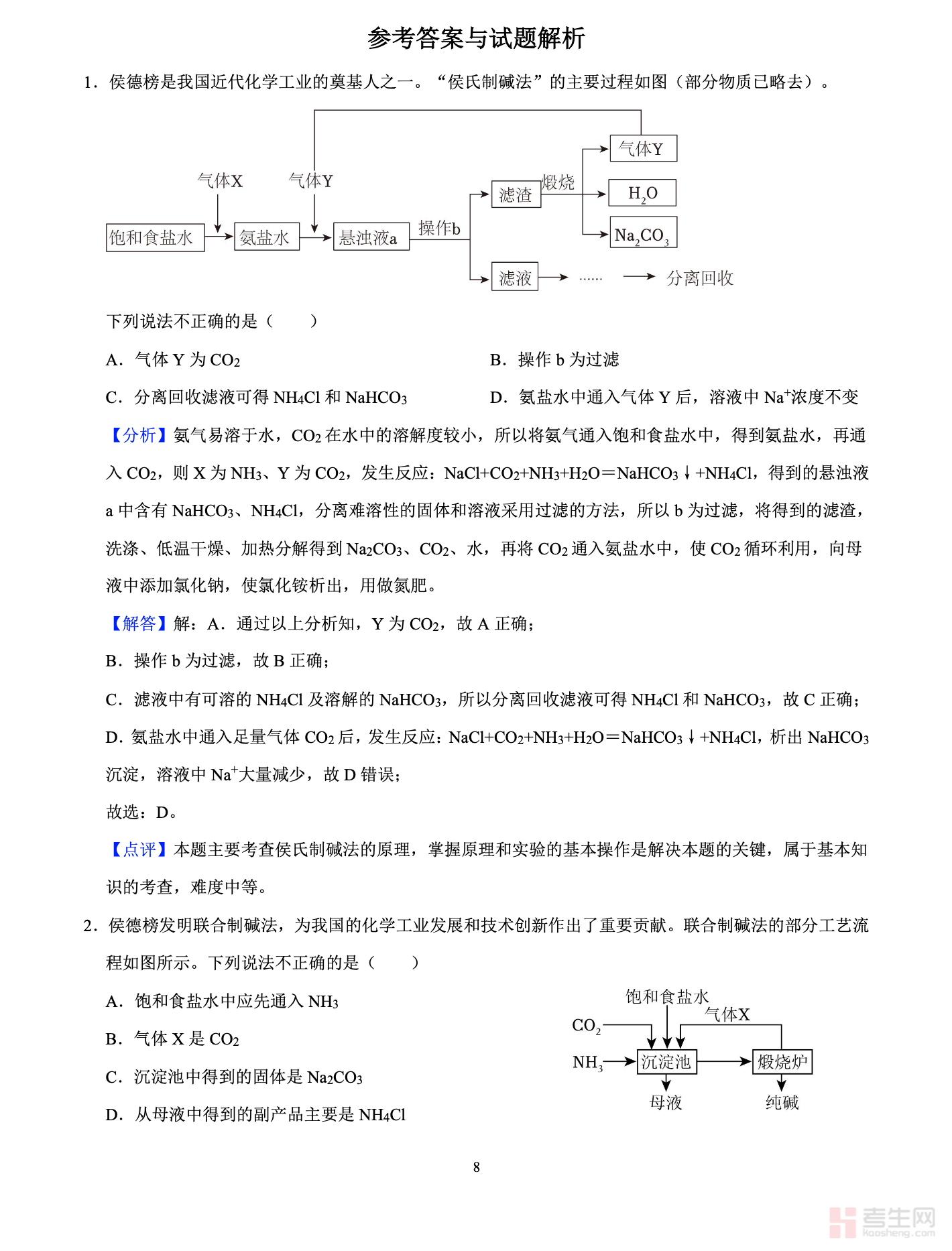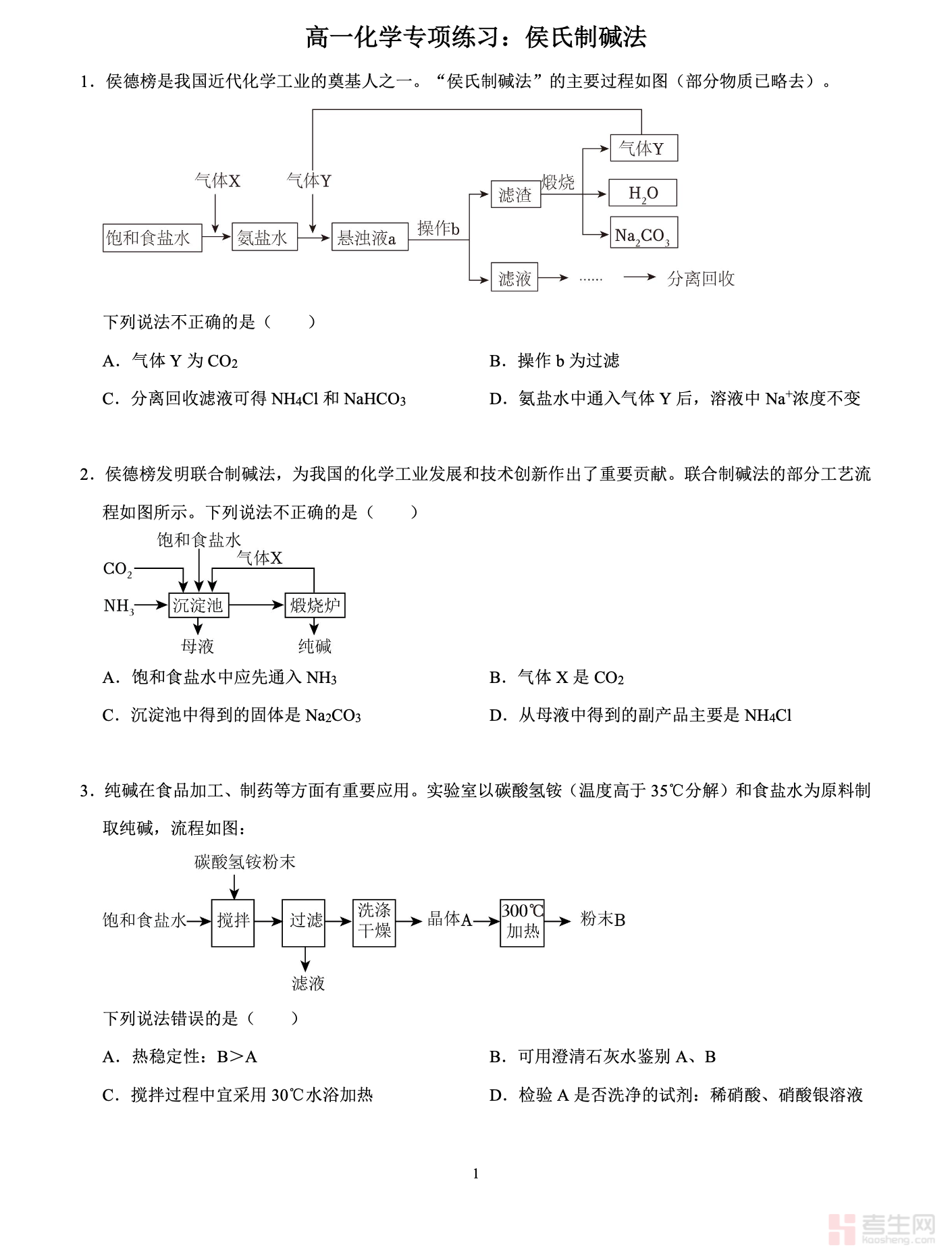高一化学专项练习:侯氏制碱法(含答案解析)