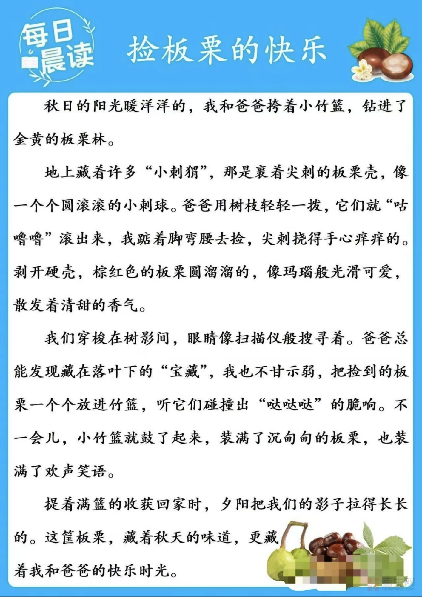 这份资料以 “捡板栗的快乐” 为核心,将秋日山林的自然景致、捡板栗的互动场景与童年野趣、亲情陪伴紧密融合,既是晨读时唤醒美好记忆的 “治愈读本”,也是练笔时激发创作灵感的 “素材宝库”。