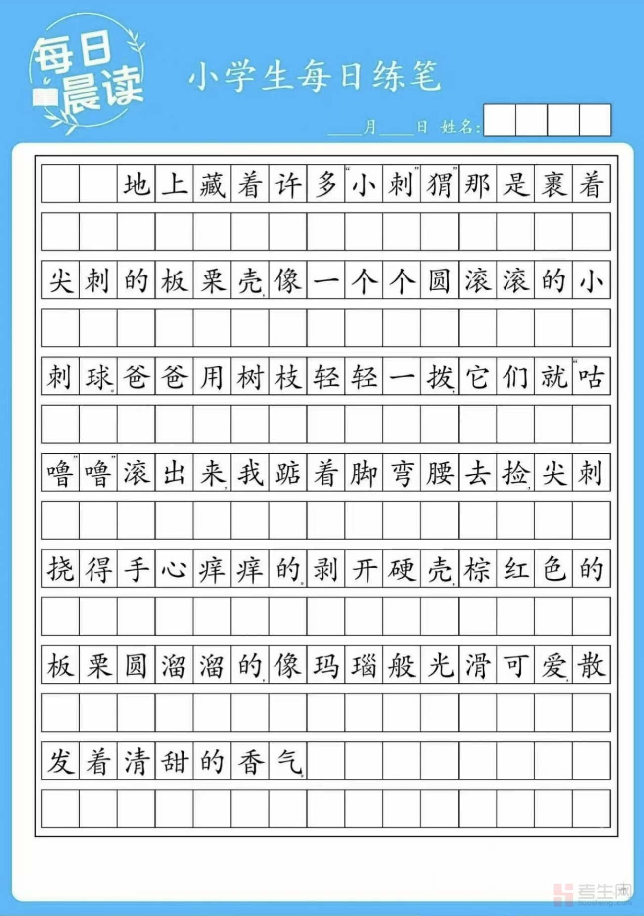 资料已上传至考生网,下载路径简单便捷:登录考生网,搜索 “《捡板栗的快乐》晨读 + 练笔资料”,即可一键获取。你可以在清晨伴着晨光品读捡板栗的故事,也可以在秋日周末走进山林,结合实际体验完成练笔,让每一段文字都盛满山野的童趣与丰收的喜悦。