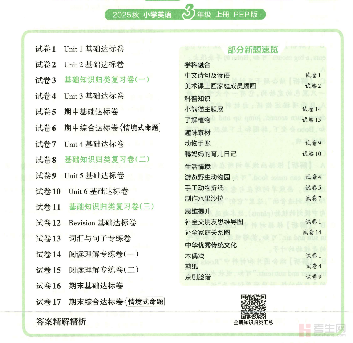 25秋 王朝霞活页卷英语 人教PEP版3上