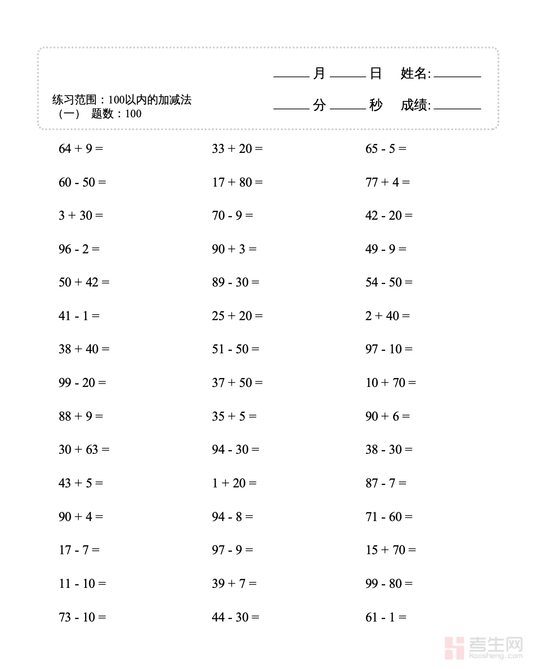【1年级上】100以内的加减法(一)4000题(80页)