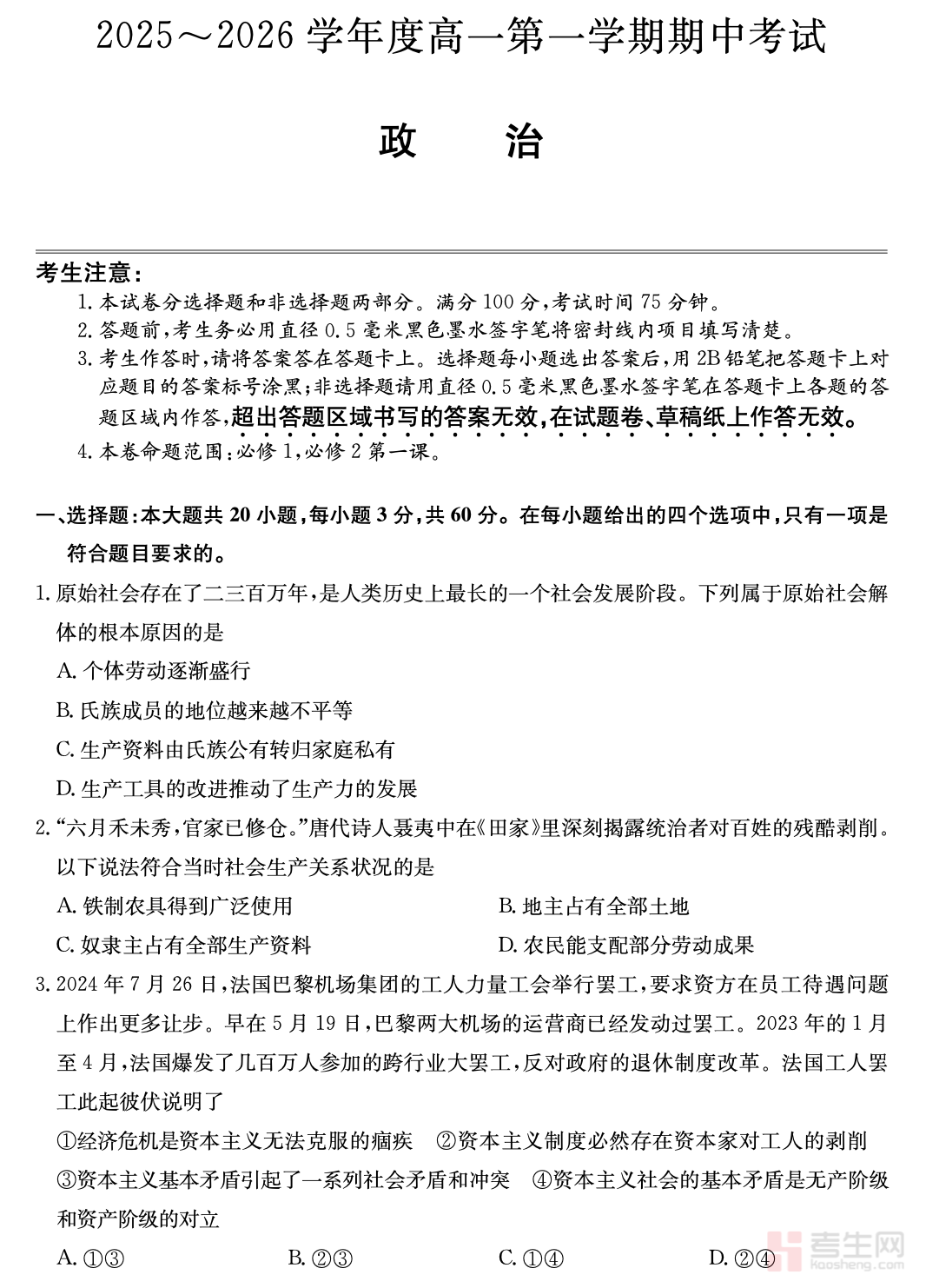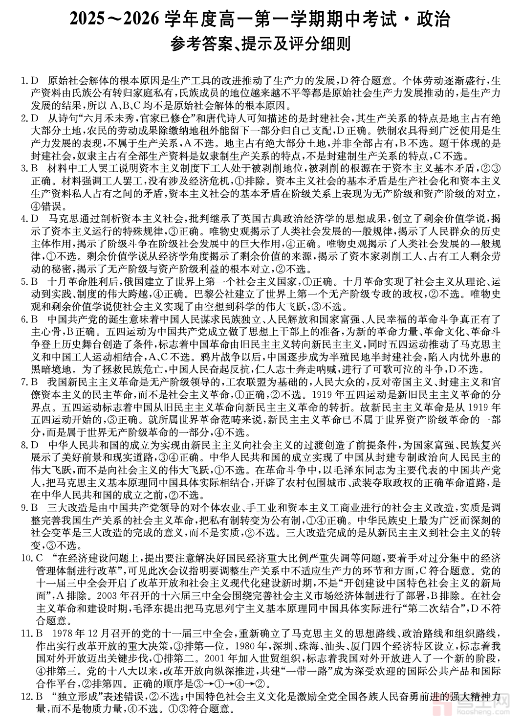 2025~2026年度高一第一学期期中考试(政治)(含答案解析)