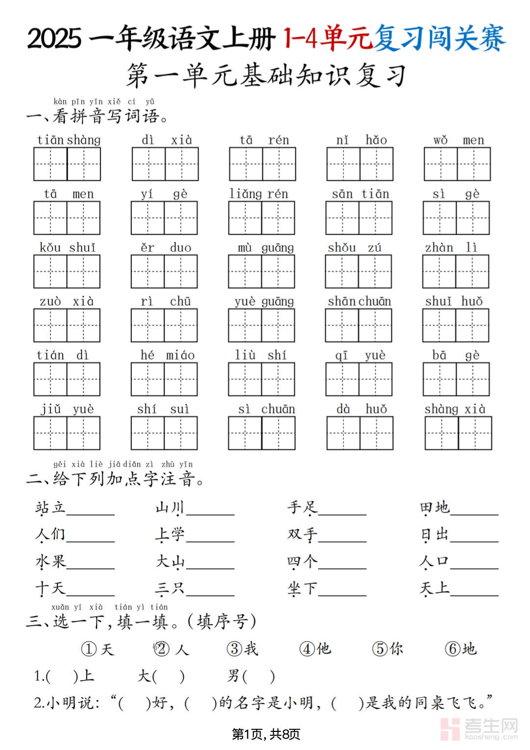 25一年级上语文期中复习1-4单元复习闯关赛(8页)