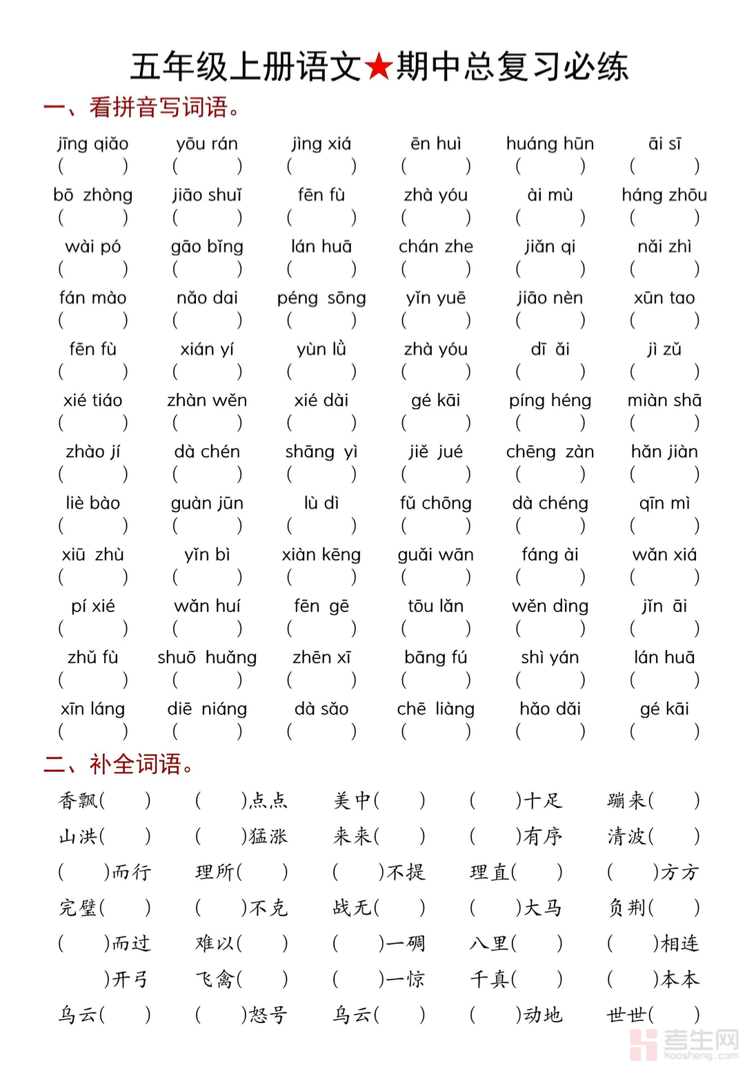 五年级(上)语文期中总复习必练