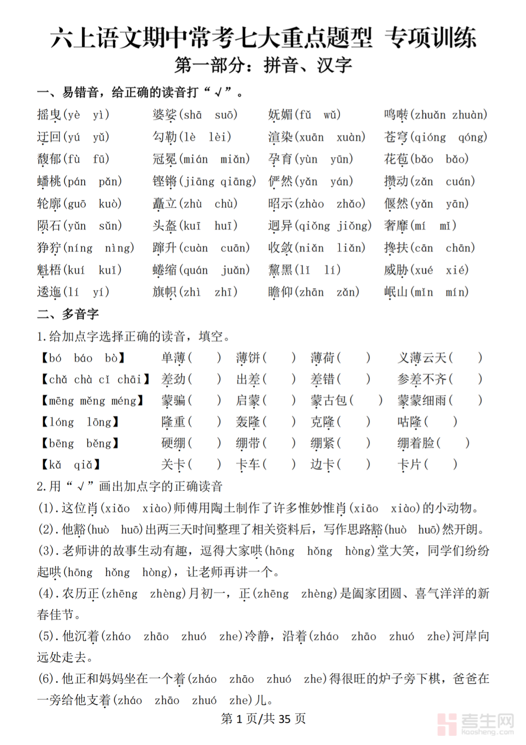 六上语文期中常考七大重点题型专项训练(空白)