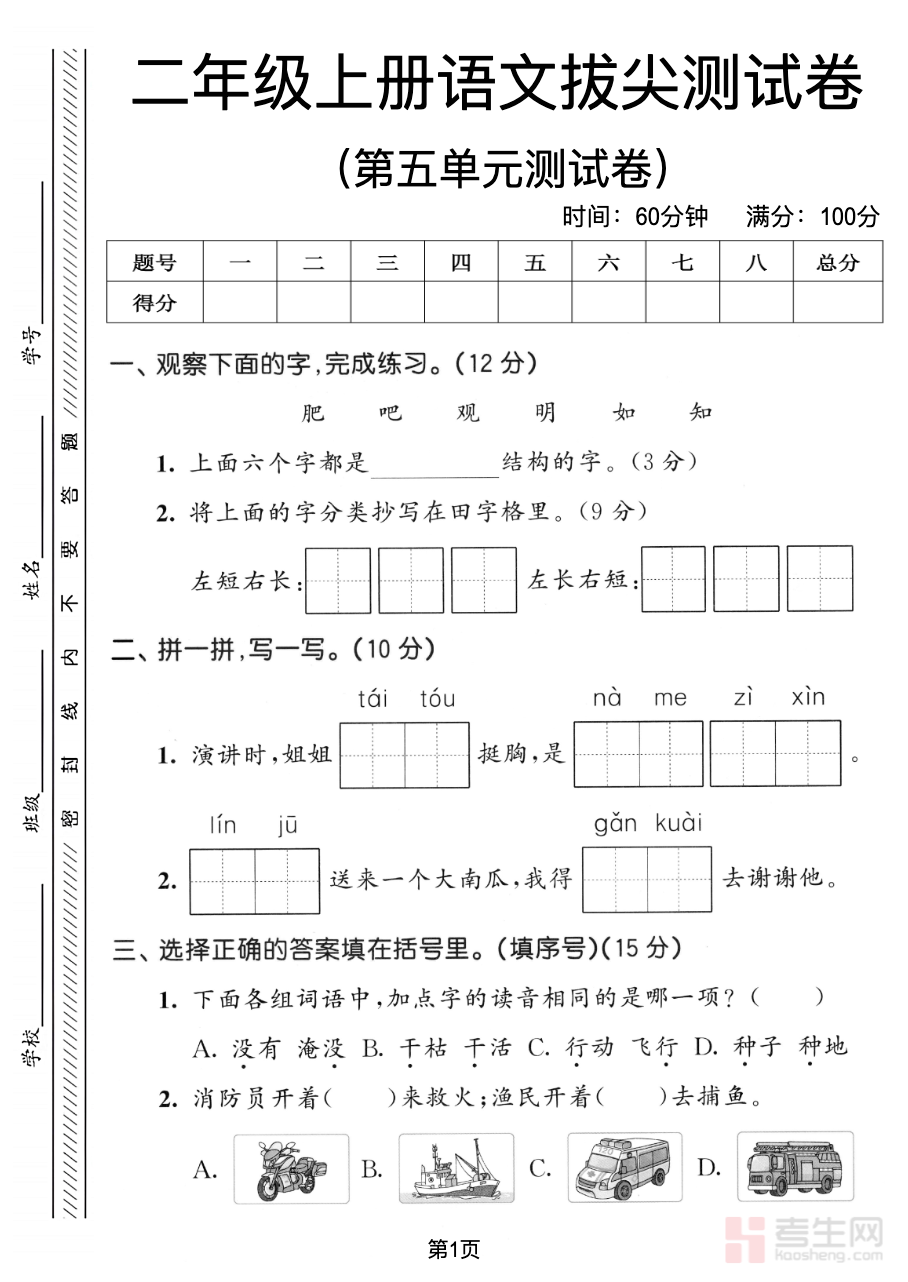二年级(上)语文第五单元测试卷(含答案解析)