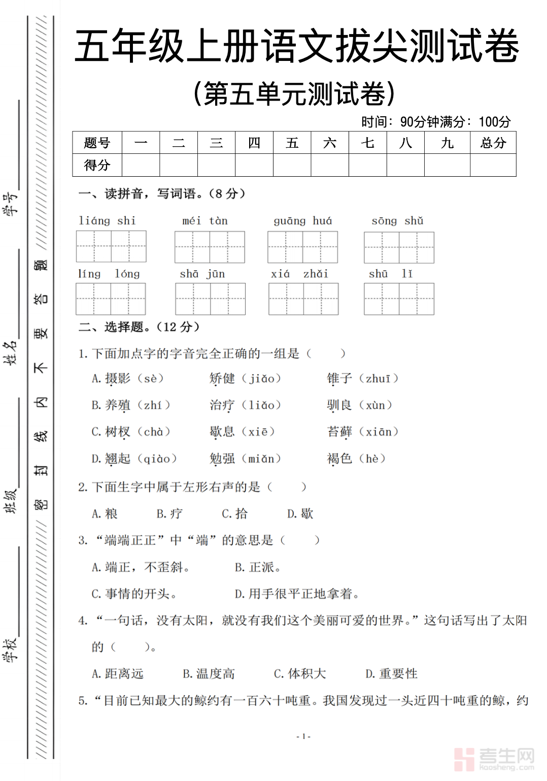 五年级(上)语文第五单元测试卷(含答案解析)