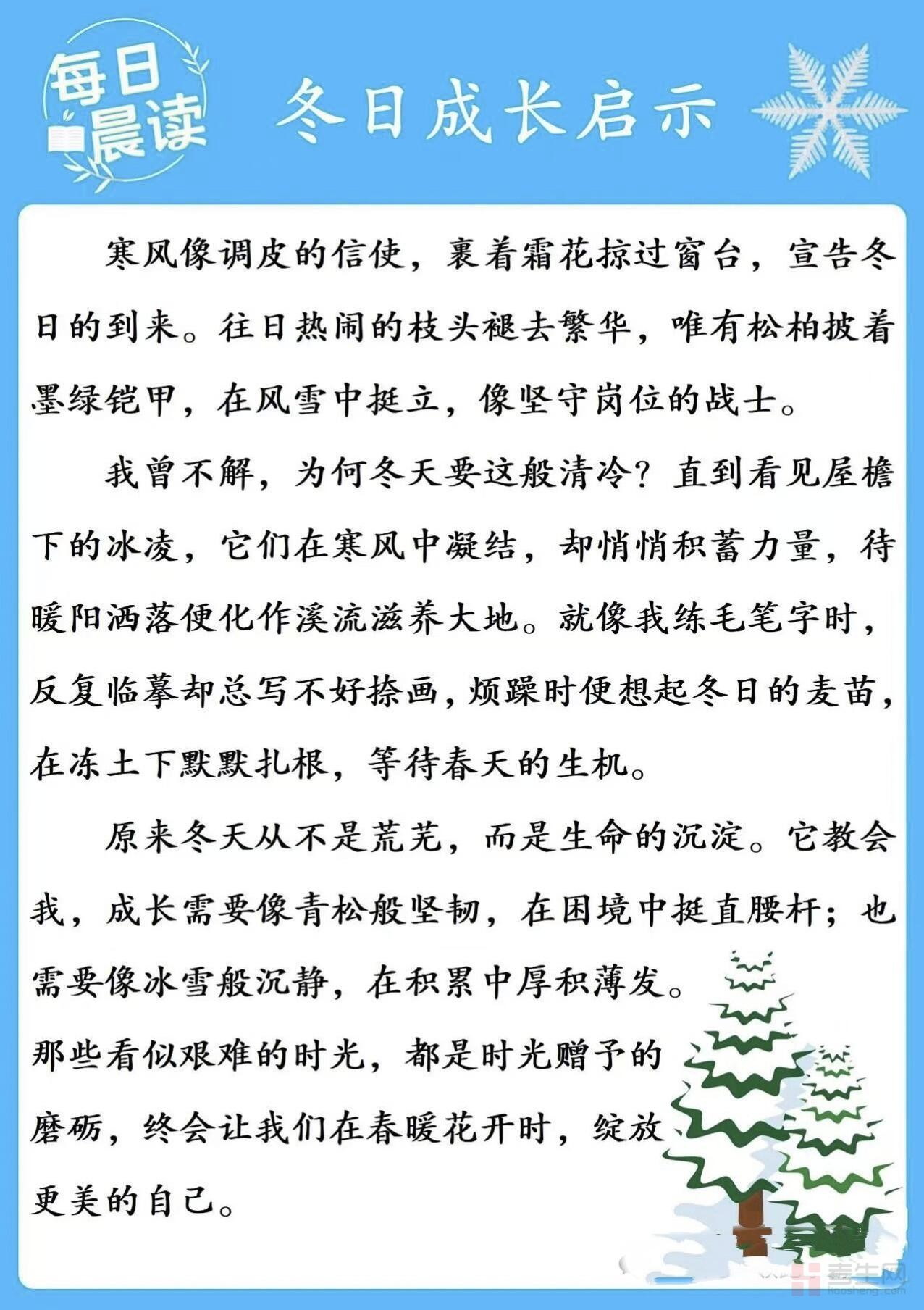 这些自然现象不仅描绘了冬日的独特景致,更将 “坚守”“忍耐”“积累”“协作” 等成长品质具象化,让读者在晨读中直观感受逆境成长的力量。