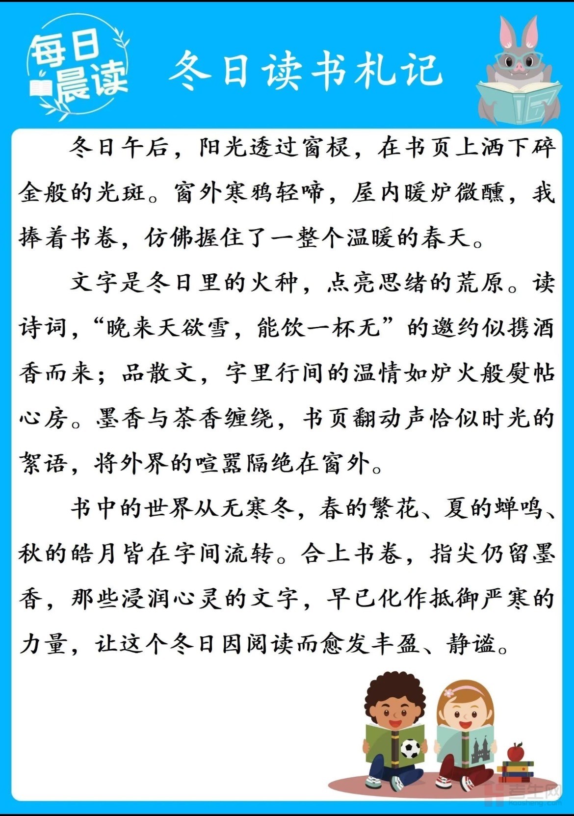 文字中融入了冬日读书的细腻细节:指尖触碰书页的微凉触感、热茶氤氲的水汽、笔记本上工整的批注、雪夜灯光下书页的影子,这些场景不仅能积累 “阅读”“冬日”“成长” 主题的写作素材,更能学习 “情景交融”“以读促写” 的手法,唤醒对阅读的热爱与对成长的追求。